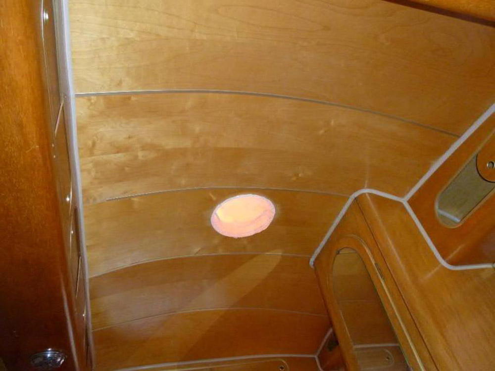 Flink schuren en een paar liter hoogglans lak zou hier al wonderen verrichten. Mooie lijnen, inclusief houten plafond. |