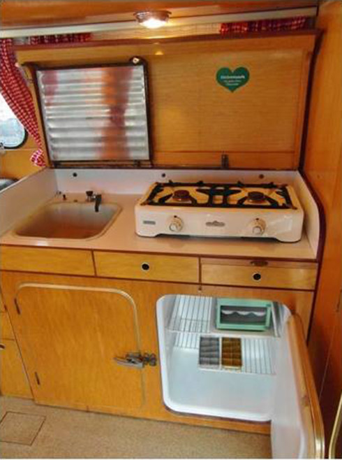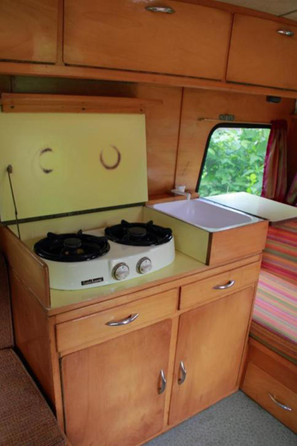Aan het keukentje en de gebruiksvoorwerpen kun je zien hoe oud deze caravan is... |