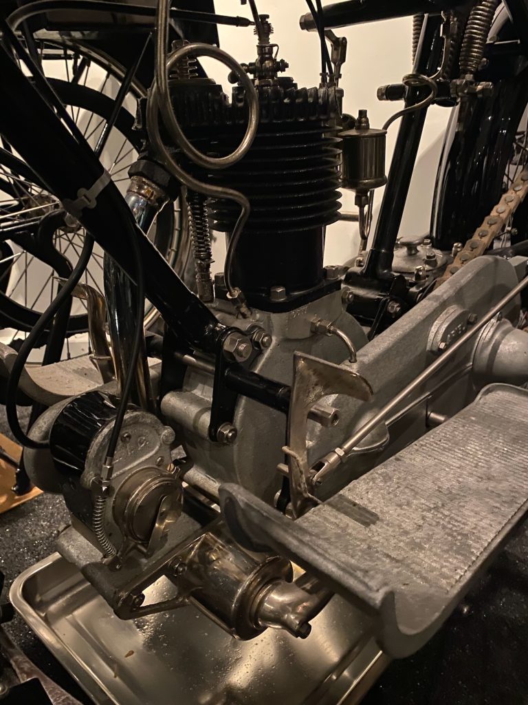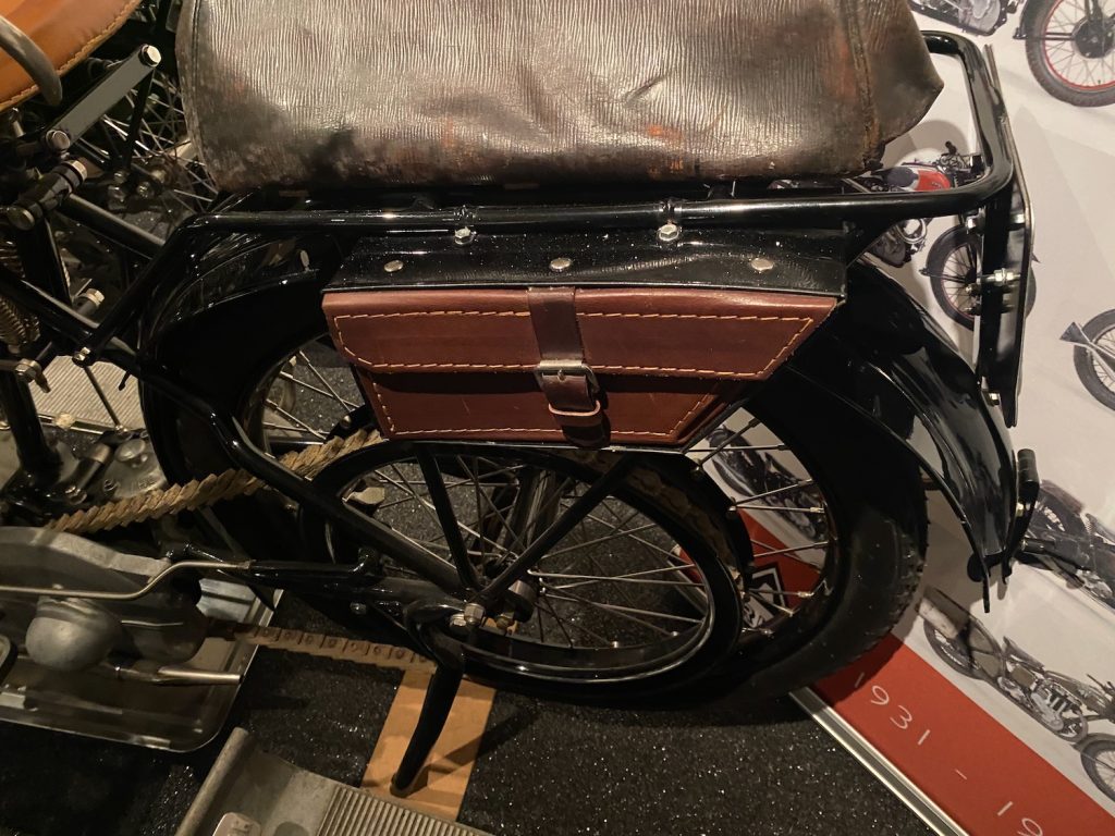 BSA begon in 1910 met het maken van Motoren. Deze Model-H werd van 1914 tot 1926 geproduceerd. Met 557cc in de zijklepper goed voor 4,5 PK. Primaire en secundaire aandrijving beide via ketting. Riem is mooier, maar dit is wel praktisch…