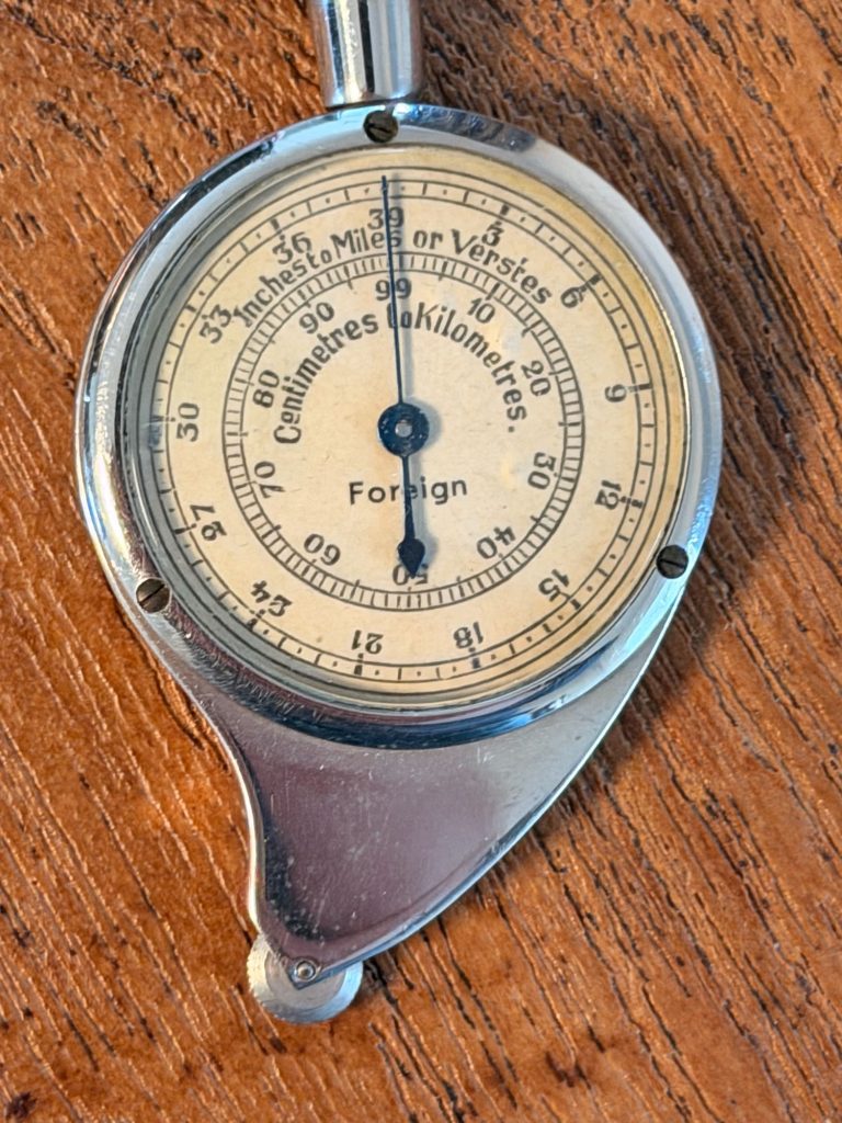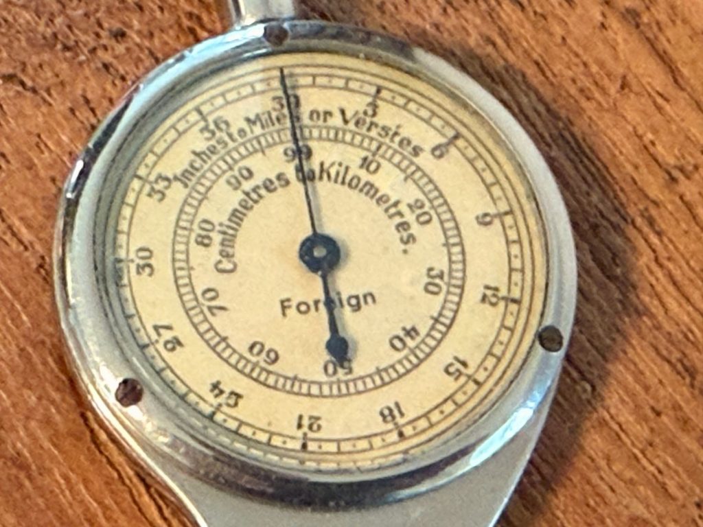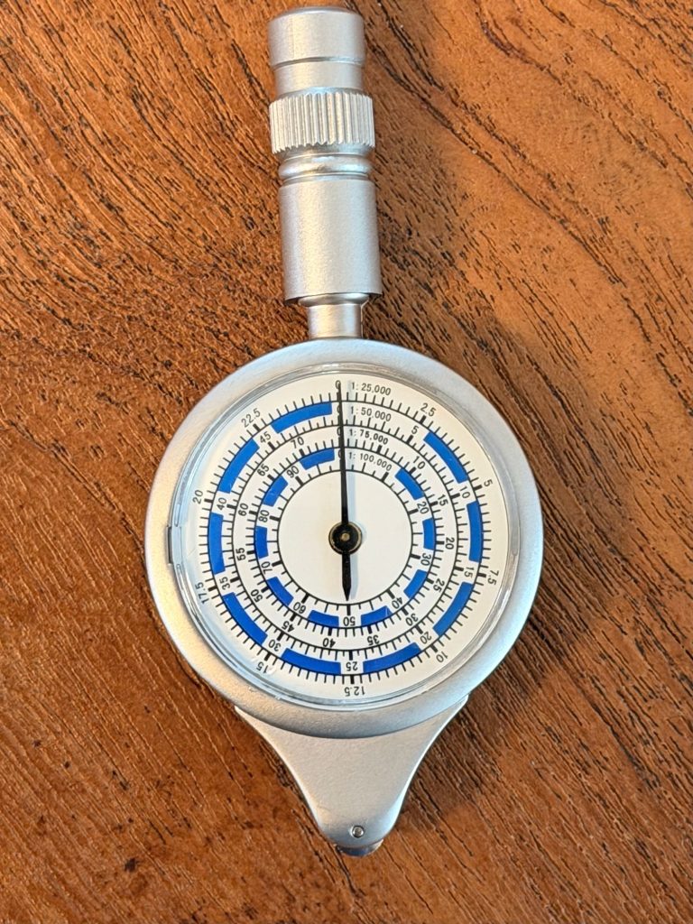 Andere namen voor Curvimeter zijn Opisometer, Kaartwiel, Wegmeter of Krom-tel-instrument 😉