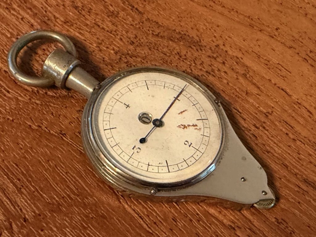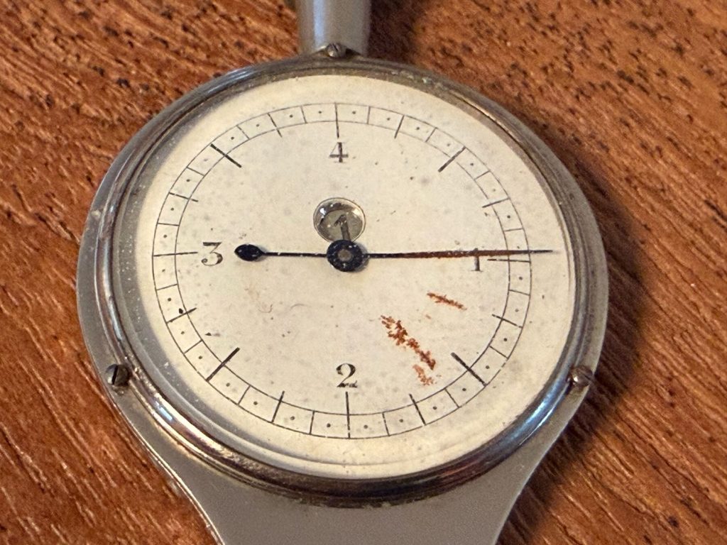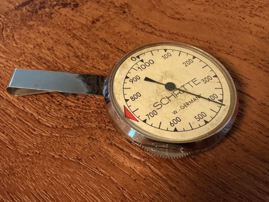 Op Ebay staat vanalles, maar uit de US zijn de verzendkosten meer dan wat ik hier voor de curvimeter zelf betaal. Maar ja, van hier heb ik ze een heel eind. Toch maar gekeken en getest met enkele ‘voordelige’ uit Engeland die voor 10 en 12 euro verstuurd konden worden.. Het zijn mooi andere weer. Fijne toevoeging, inmiddels in kistje 2. Dit is echter een stappenteller: doe hem aan je broek met de clip en ge lopen, het werkt en zo telt hij tot 1000 stappen en daarna gaat het kleine wieltje links ook nog mee rond. En zo kun je dan je vele stappen tellen. Getest met schudden. Hij werkt nog steeds. Met het wieltje kun je hem ook weer op 0 zetten. Hoort er dus niet echt bij, maar is een mooie toevoeging uit de jaren ’60 schat ik.