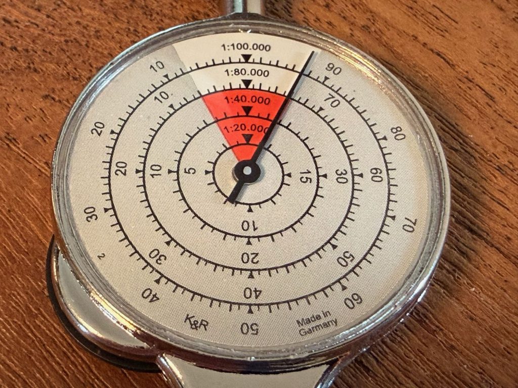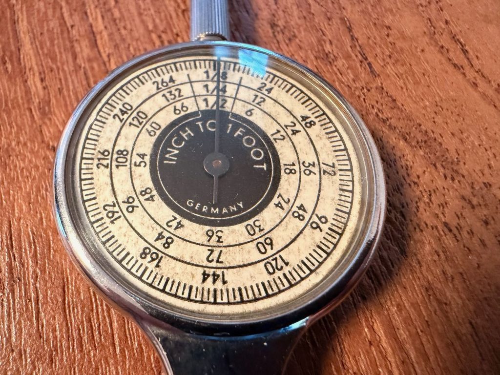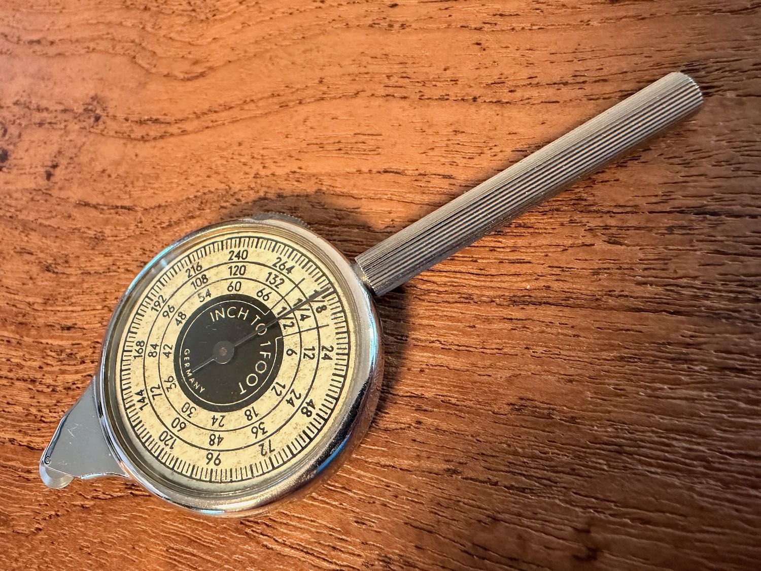 Dit is een bijzondere met een kleine schaal: 1 rondje is 4 inch, 10 cm ongeveer. Dan gaat het tellertje al omhoog. Met de cijfers 0-9 kan hij dus maximaal 40 inch meten (een meter). Deze is dus al 2x rond op 20 cm. Andere curvimeter hebben dan slechts 1/6 van de cirkel afgelegd. Meer precisie dus voor kleinere afstanden.