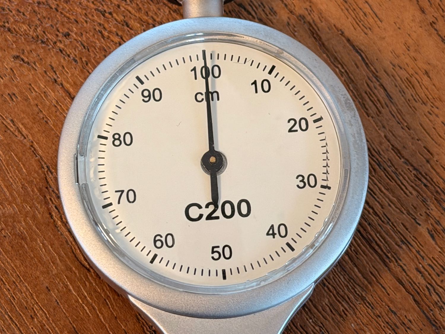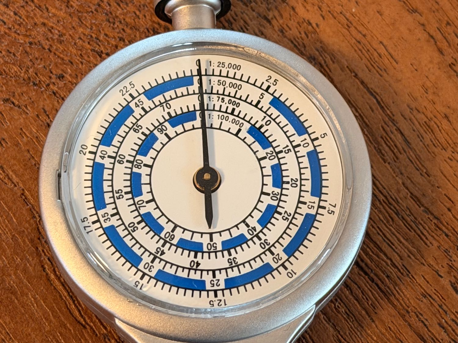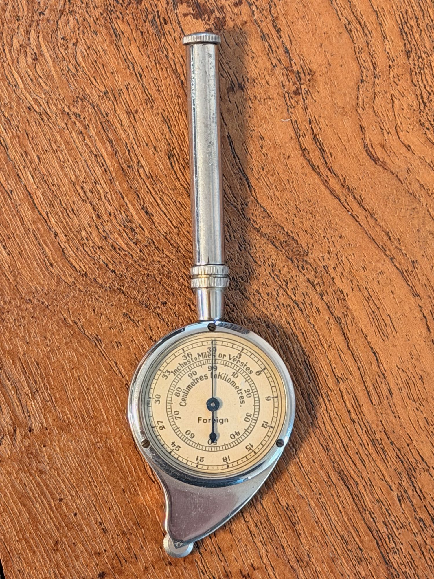 Dit is een bijzondere met een kleine schaal: 1 rondje is 4 inch, 10 cm ongeveer. Dan gaat het tellertje al omhoog. Met de cijfers 0-9 kan hij dus maximaal 40 inch meten (een meter). Deze is dus al 2x rond op 20 cm. Andere curvimeter hebben dan slechts 1/6 van de cirkel afgelegd. Meer precisie dus voor kleinere afstanden.