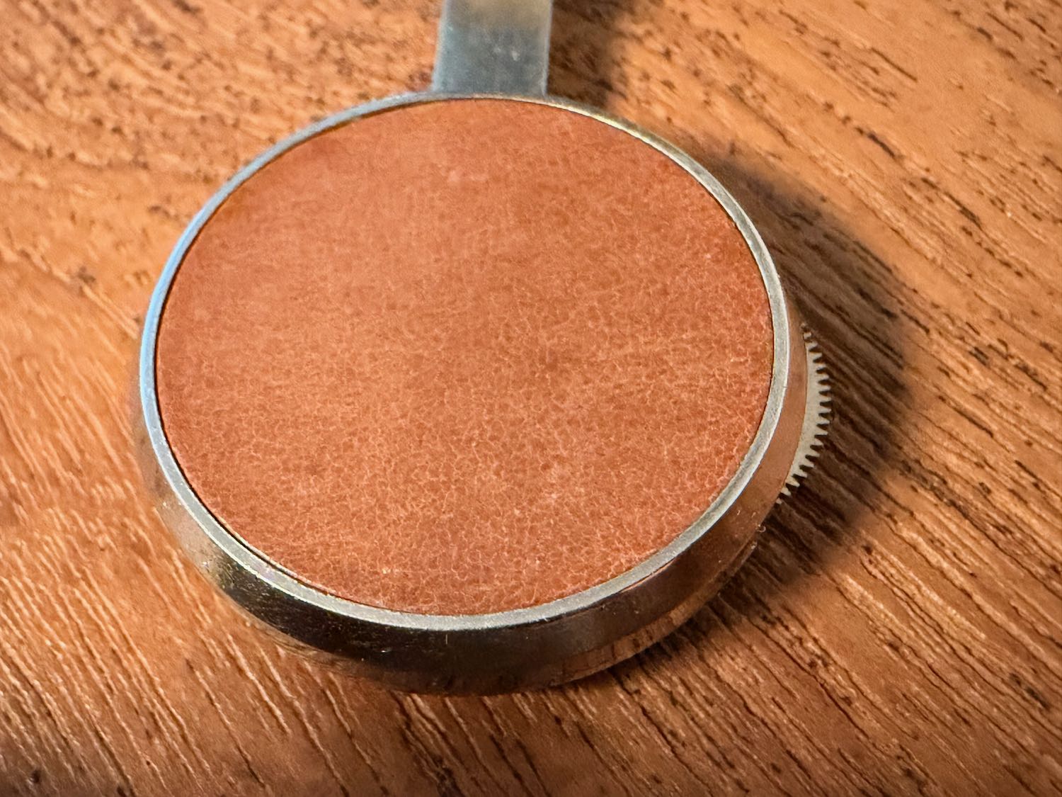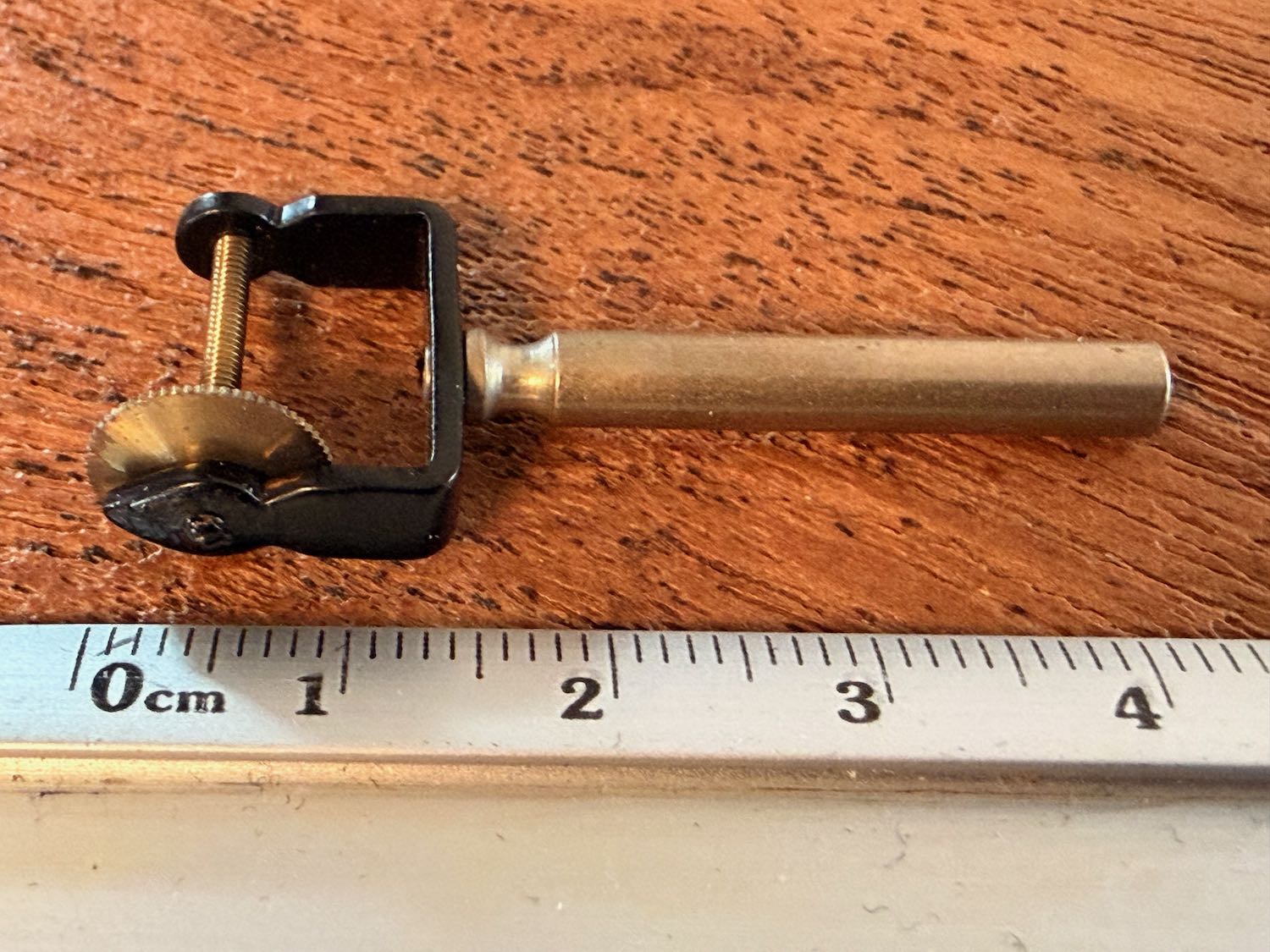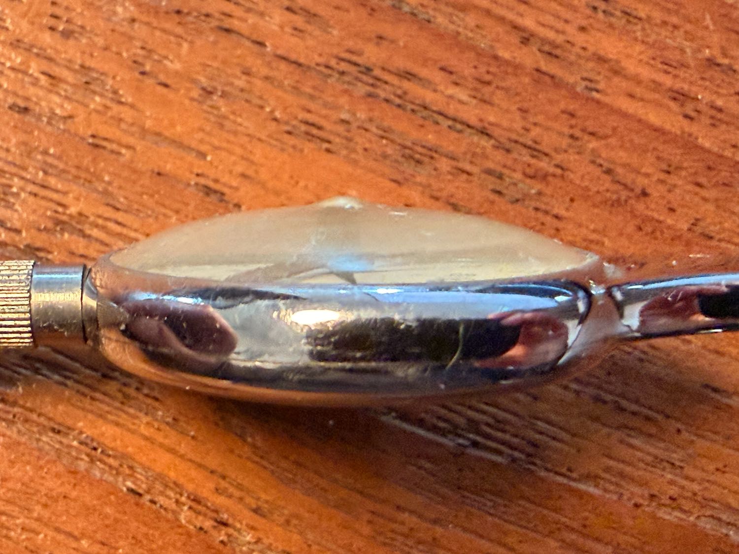 Ik dacht dat ik klaar was, maar de automatische zoekfunctie van Marktplaats leverde toch weer een mooie variant op. Een oude zo te zien. Omdat de voet er scheef onder zit kun je deze ‘makkelijker’ van boven naar beneden trekken. Ik heb het even getest, het verschil is minimaal, maar wel merkbaar. Helaas is het glas wat dof en is het steeltje wat raar / niet origineel meer. De ‘klok’ is amper 35 mm.