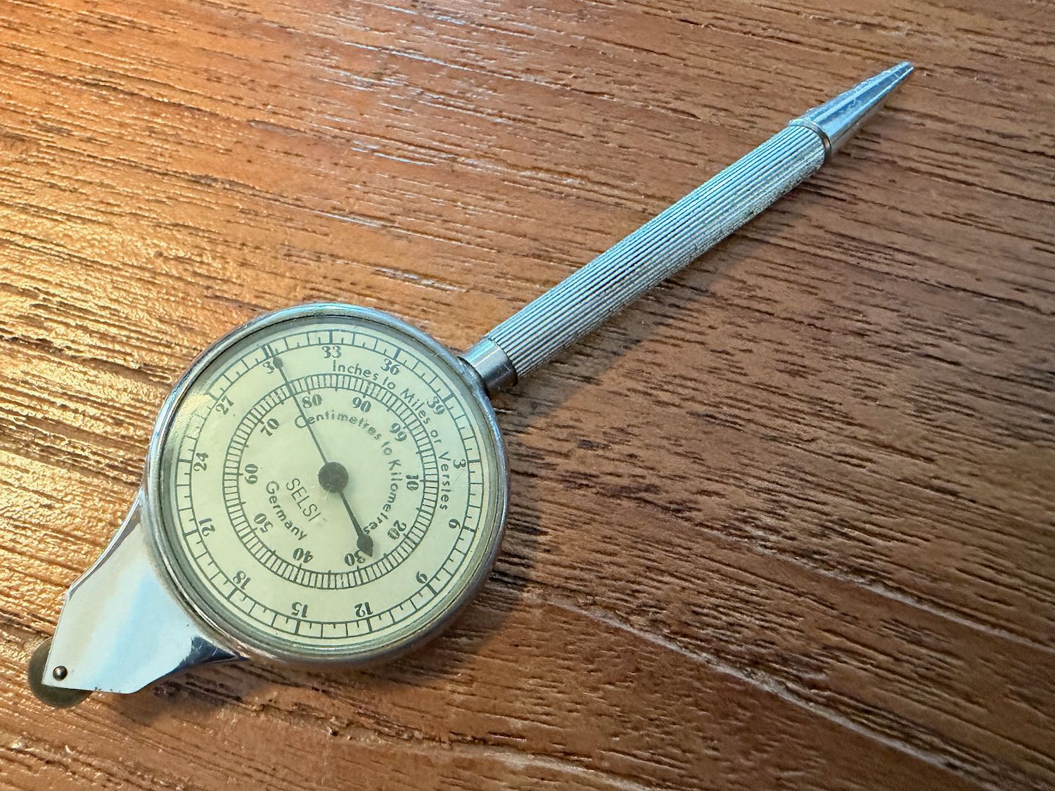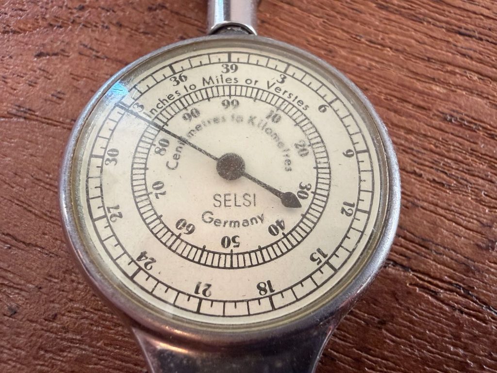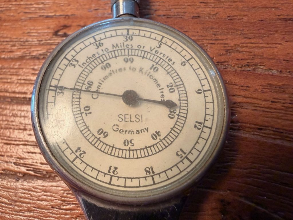 Ik ben toch maar op Ebay gegaan en dan is er opeens een compleet nieuw aanbod (in inches en miles). Deze scoorde ik voor 10$, dus da’s nogal te overzien, maar met verzendkosten werd het drie keer zo veel. Er zijn nog een paar speciale onderweg (Duurt weken). Deze heeft dus een schaal van 1 : 100.000 > Hij meet vooral gewoon de cm en inches. Hij schijnt ook verstes aan te geven: een Russische maat en dus een internationaal apparaatje met drie eenheden erop. Als de schaal inch-to-mile is rol je dus een inch, maar is dat op die kaart 1 mijl, een schaal van 1 op 63.360 dan dus… Voor verstes is de schaal 1 op 42:00. Deze werkt dus maar op 1 soort kaart, met exact de juiste schaal (of alsnog even rekenen, wat niet hoeft bij veel van bovenstaande curvimeters die meerdere schalen aankunnen en zo universeler zijn.) Deze is internationaler met EU, Rusland en US schalen. Het merk Selsi stamt uit 1854, als optiek-, en instrumentenimporteur in de VS.