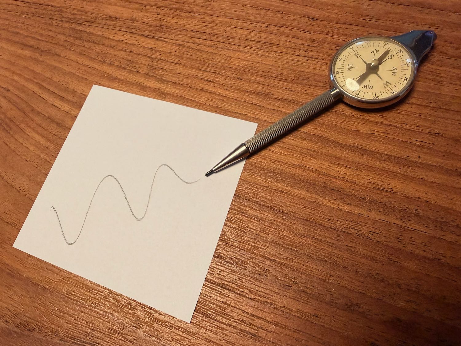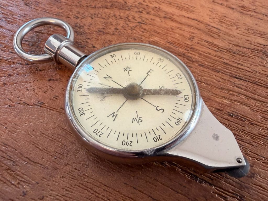 Het ging me om de volgende, maar deze moest ik samen kopen. En dus heb ik nu nog een Selsi. Wat bij deze wel opvalt is dat de houder voor de kompasnaald als een ‘nippel’ op het plastic ‘glaasje’ ligt. Alsof het er bijna doorheen steekt. Is bij bovenstaande exemplaar niet het geval. En… Dit luxe exemplaar is ook nog eens voorzien van een vulpotlood in de houder. Met deze heb je alles bij de hand voor een voorspoedige reis.