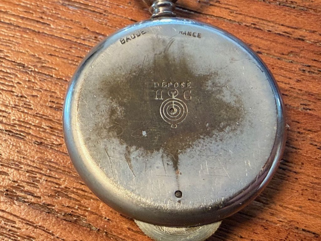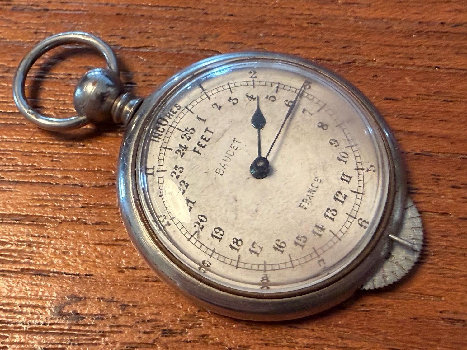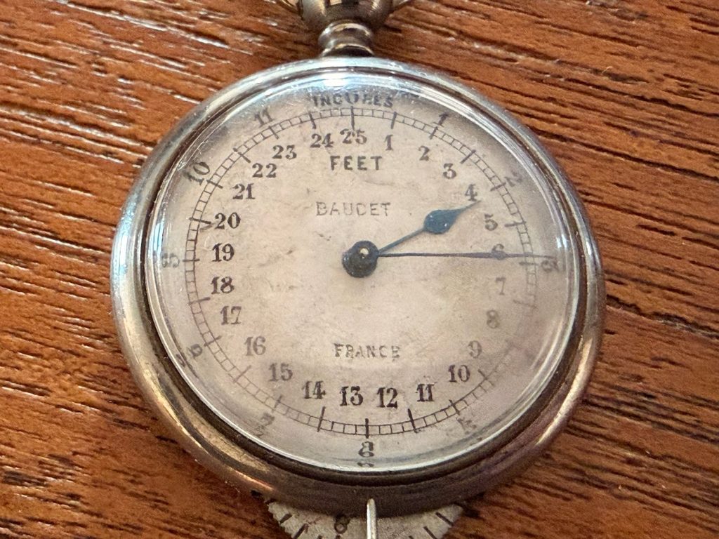 Hier ging het dus om. Deze wilde ik graag hebben en die hierboven zat erbij. Mooie slijtage, maar deze is dan ook al ongeveer 100 jaar oud. Ook mooi te zien aan het lettertype. Baudet was een Franse maker van precisie instrumenten in de late 19e en vroege 20e eeuw. Deposé op de achterkant staat voor ‘geregistreerd merk’ wat vooral gebruikt werd tussen 1880 en 1920: een mooi hulp voor de tijdsbepaling. De grote wijzer doet de inches, maar de kleine wijzer laat meteen de afstand in feet zien !