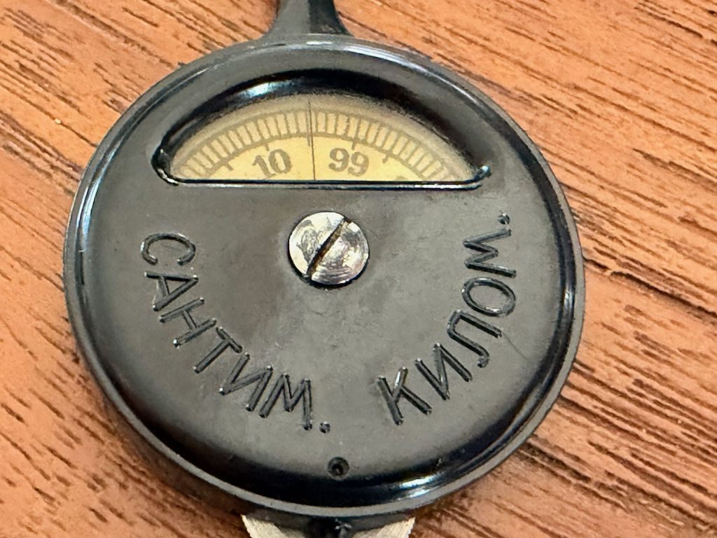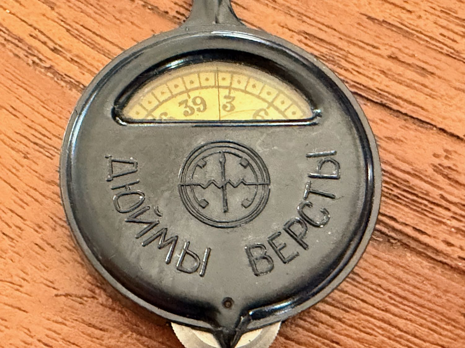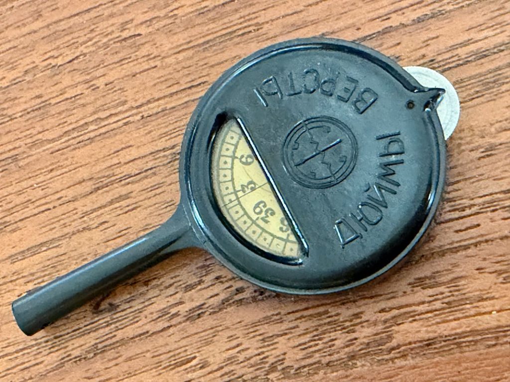 Deze komt uit Rusland, maar gekocht van een Duitser in Polen. Ook mooi te zien aan de Cyrillische letters. Gemaakt van heel donkerbruin bakeliet (een van de eerste soorten ‘kunststof’). Daardoor komt deze waarschijnlijk uit de periode 1940-1960, maar waarschijnlijk na 1945 toen ze overschakelden op met metrische stelsel. Het symbool in het midden is een typisch Russisch cartografische indicatie (technisch meetlogo). Waarschijnlijk gemaakt in de Zlatoust Watch Factory in de Oerol, actief sinds 1941, of in de Krasnogorks Mechanica Works fabriek bij Moskou.