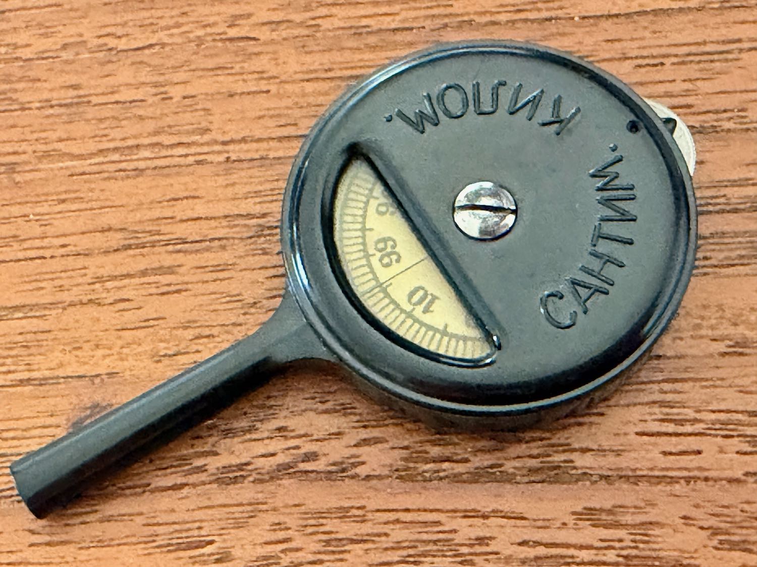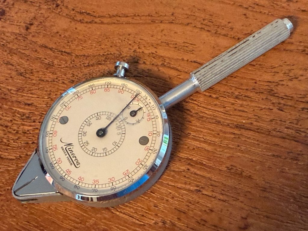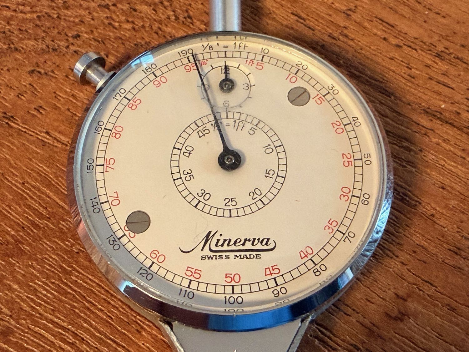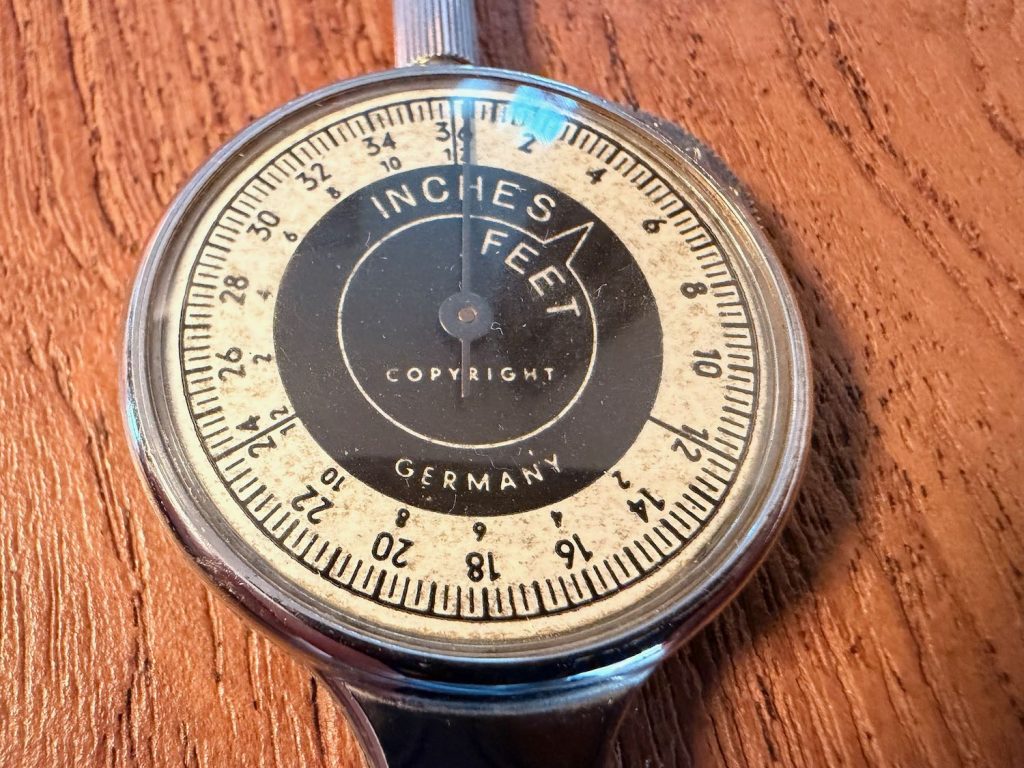 `Cm of inches zit hem vooral in de print van de schaal natuurlijk, de afstand die het wieltje aflegt blijft hetzelfde. Dit is de ultieme en ik had er al een paar keer enkele gezien en misgelopen, want hier vragen ze rustig 75 tot 100 euro voor. Het is wel een inch uitvoering, maar ik betaalde slechts een paar tientjes om het leuk te houden. Prachtig uitgevoerd met die schoeljes, de dieperliggende ‘rondeteller’ en natuurlijk de reset knop die zowel de grote als de kleine wijzer in een fractie van een seconde strak op nul zet.