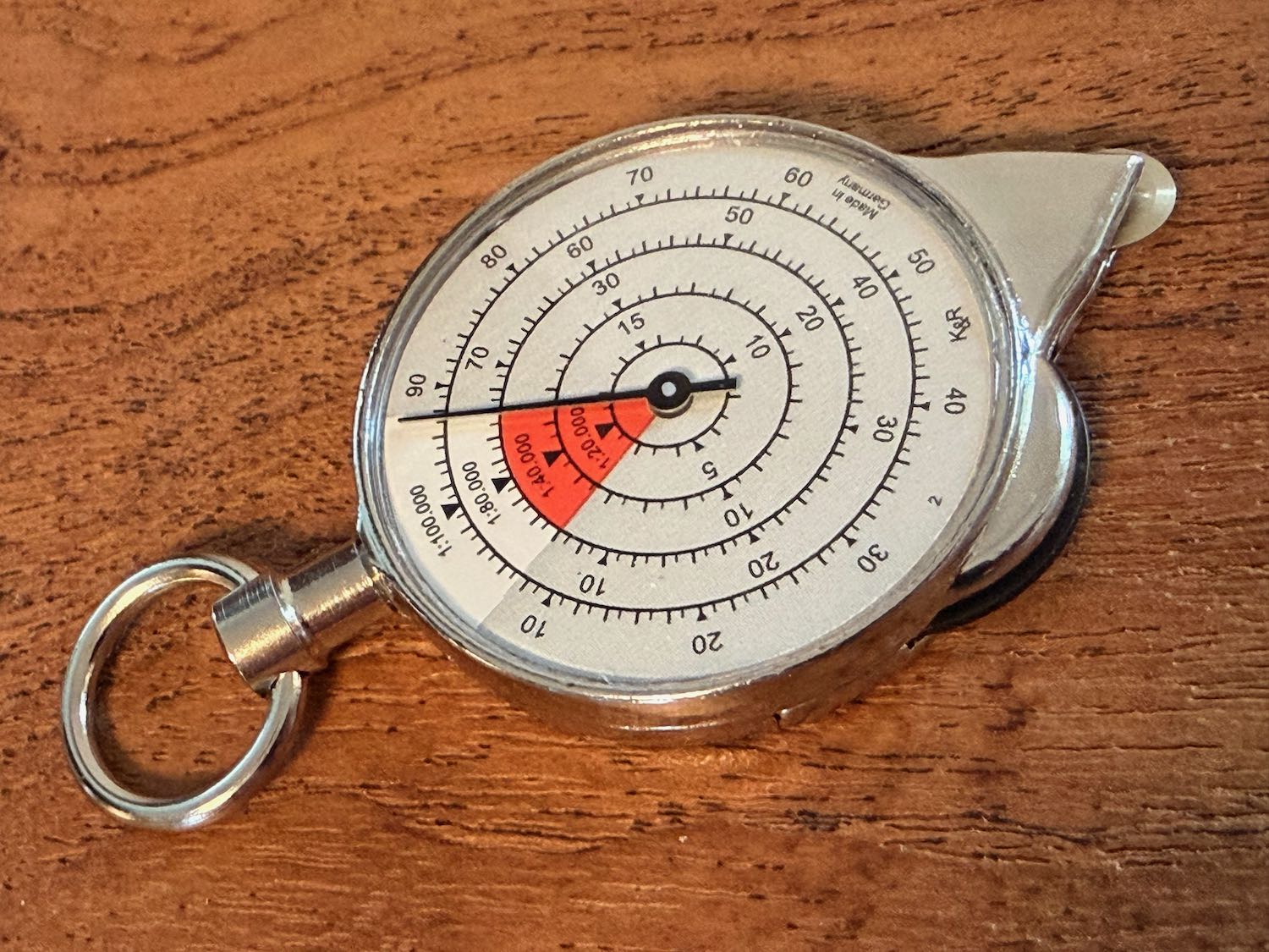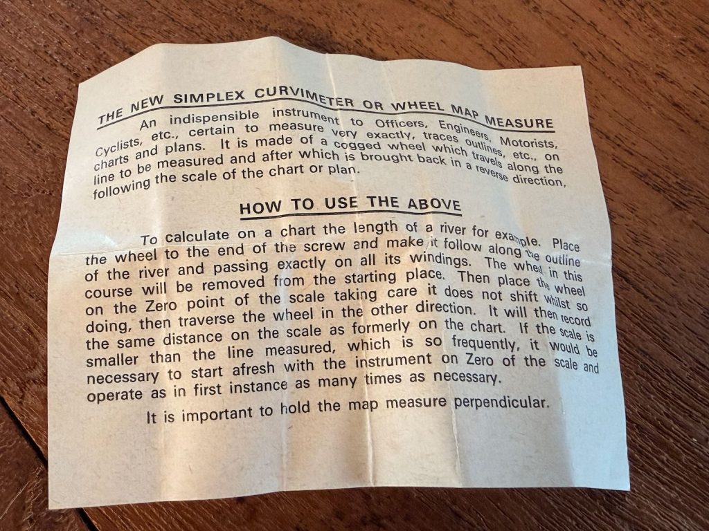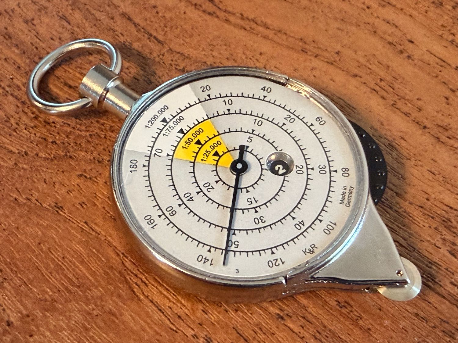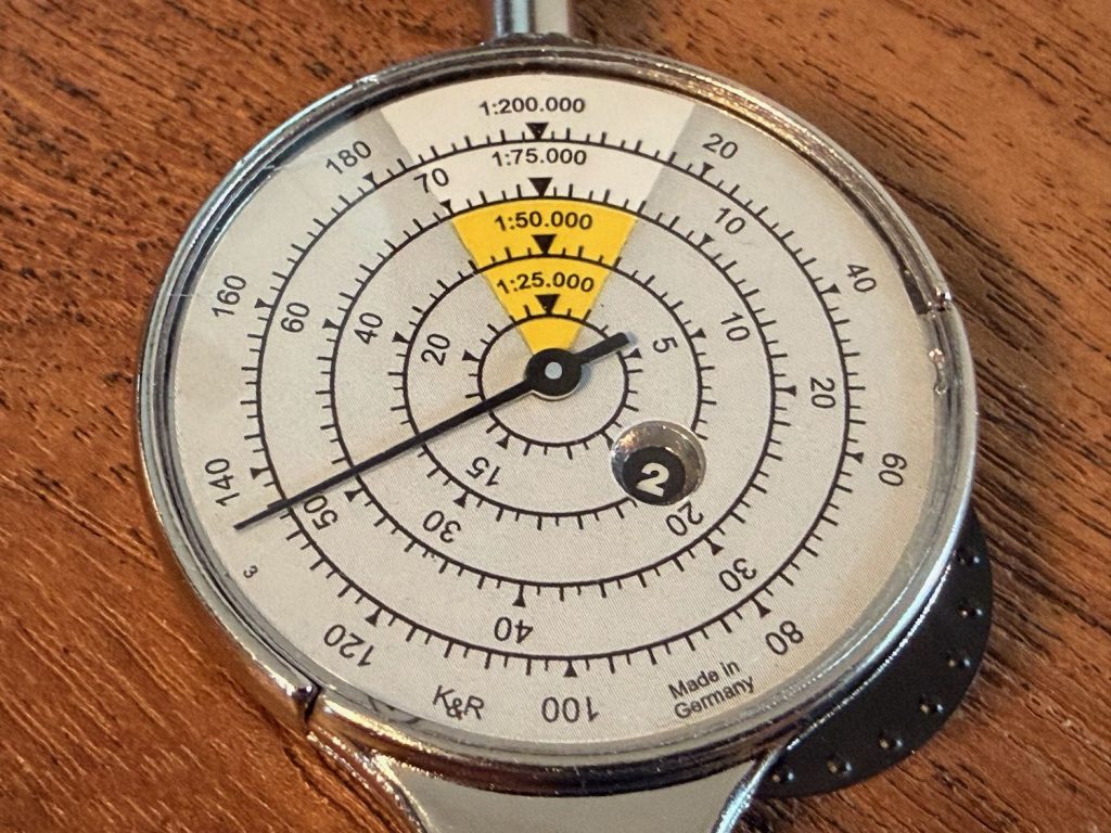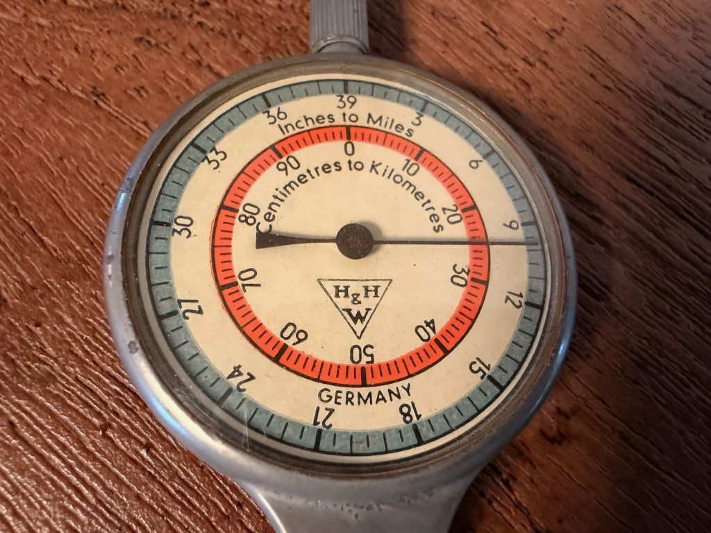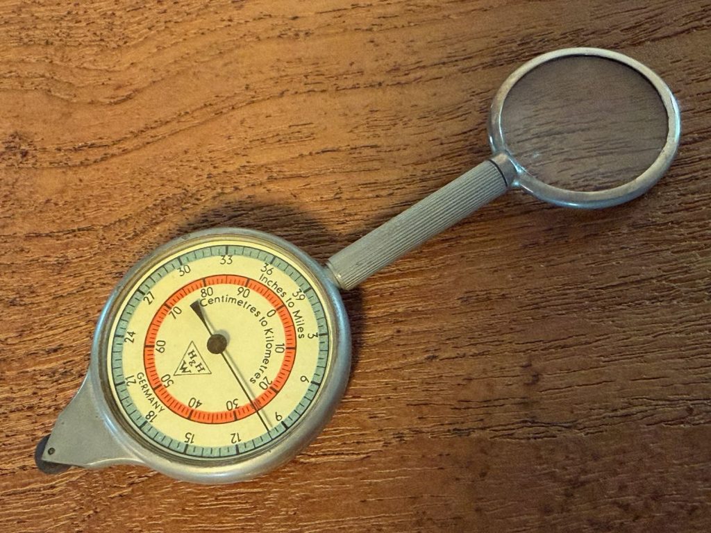 Andere namen voor Curvimeter zijn Opisometer, Kaartwiel, Wegmeter of Krom-tel-instrument 😉