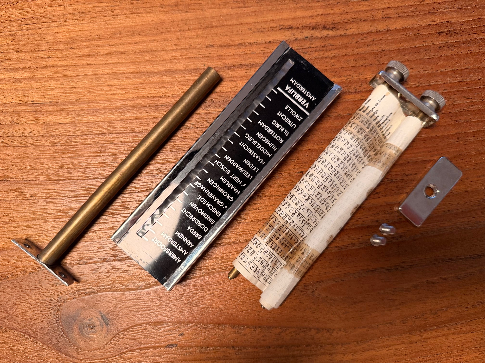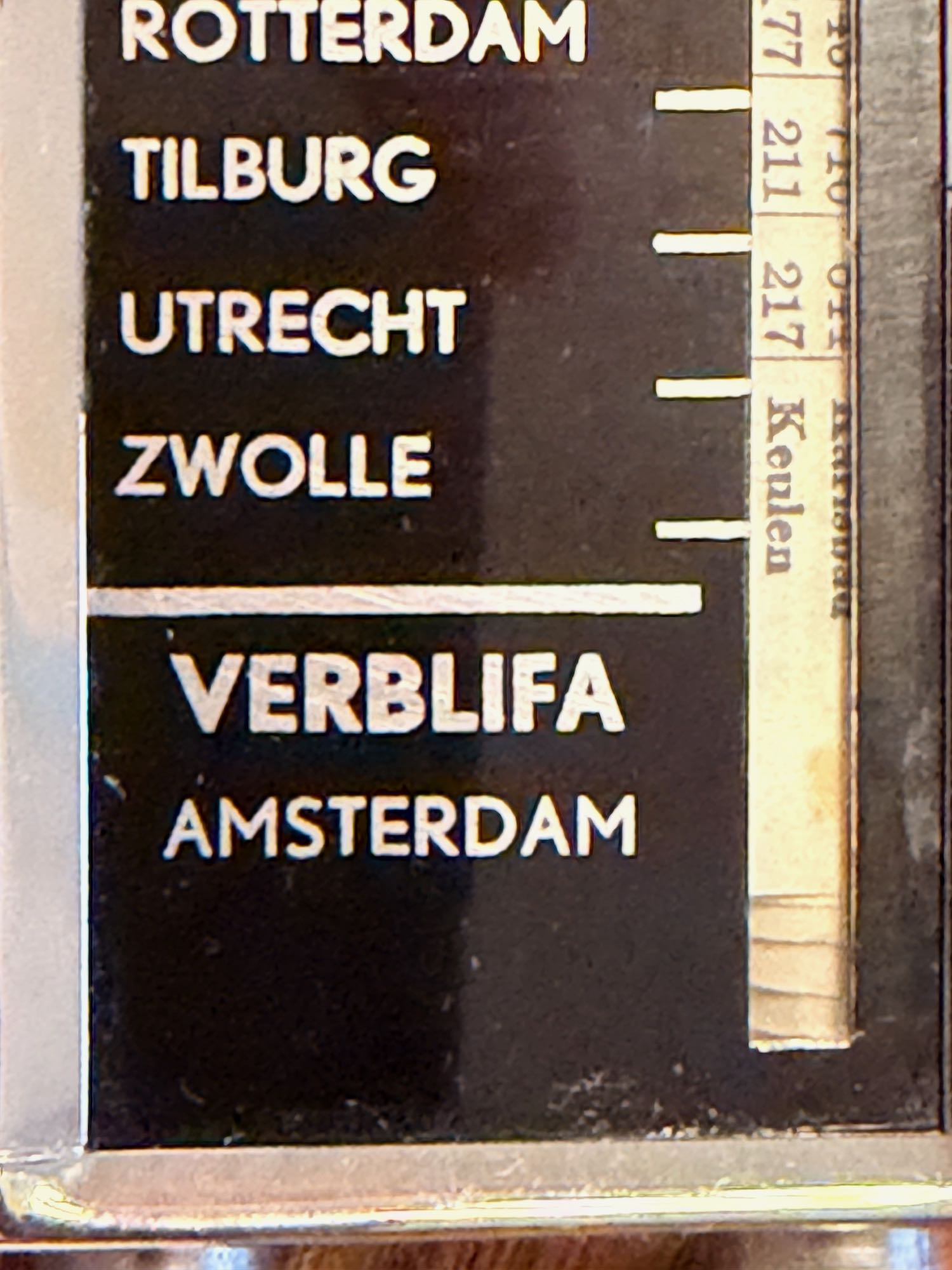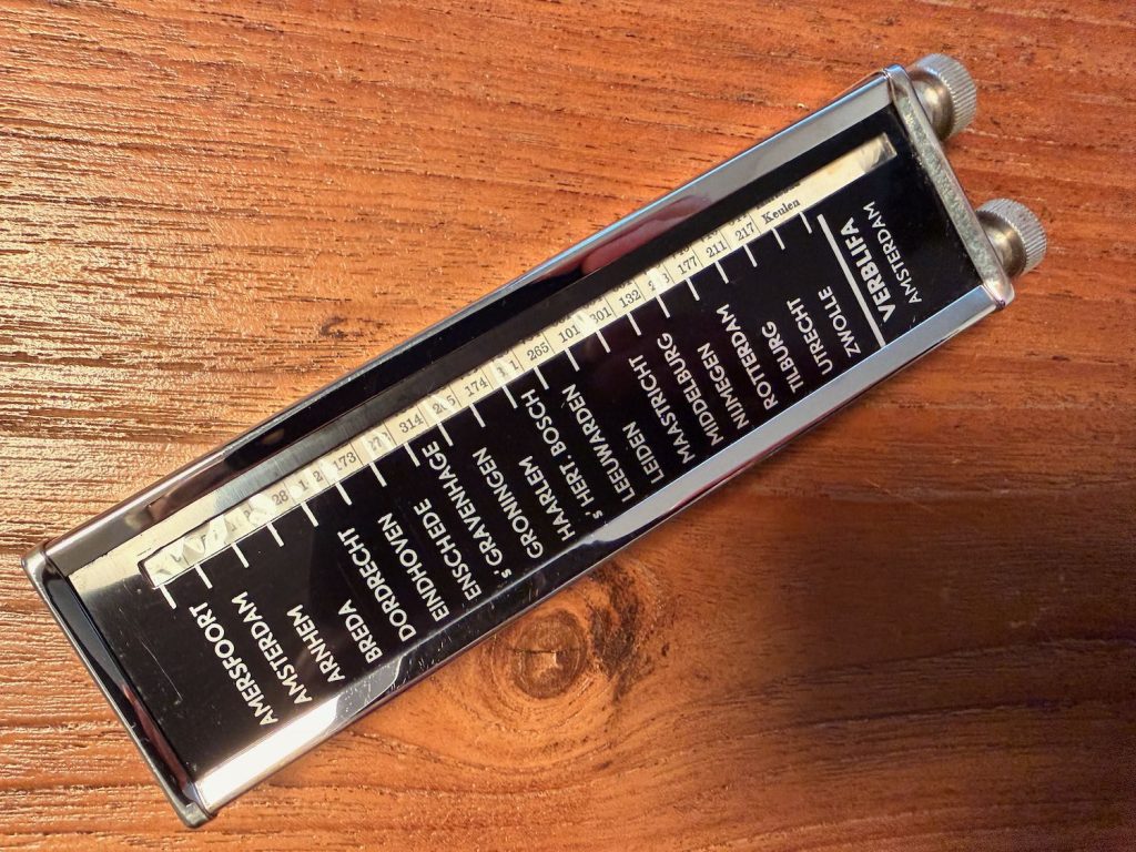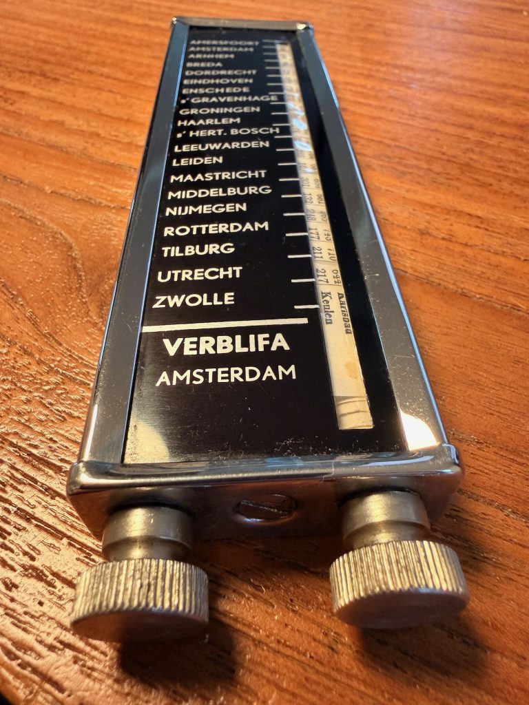 Verblifa is de fabrikant van dit apparaatje. Zeg maar apparaat, want het is toch wel 15 cm lang en weegt een paar honderd gram. Hiermee kun je de afstand tussen zo’n 110 steden op de rol in het apparaatje weergeven ten opzichte van de 20 Nederlandse steden die op de cover zijn geprint. Het apparaatje komt volgens onze Chat uit de jaren 1938-1942. Oud dus en daardoor zitten de rolletjes inmiddels wat scheef op de asjes. De plakband helpt natuurlijk ook niet, maar goed, hij is dik 80 jaar oud…:Op foto 4 moet Keulen eigenlijk wat naar beneden, zodat je af kunt lezen dat de afstand Zwolle-Keulen 217 km is. Voor een tientje heb ik weer schik 😉