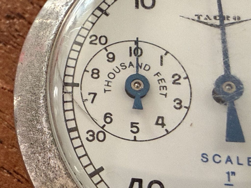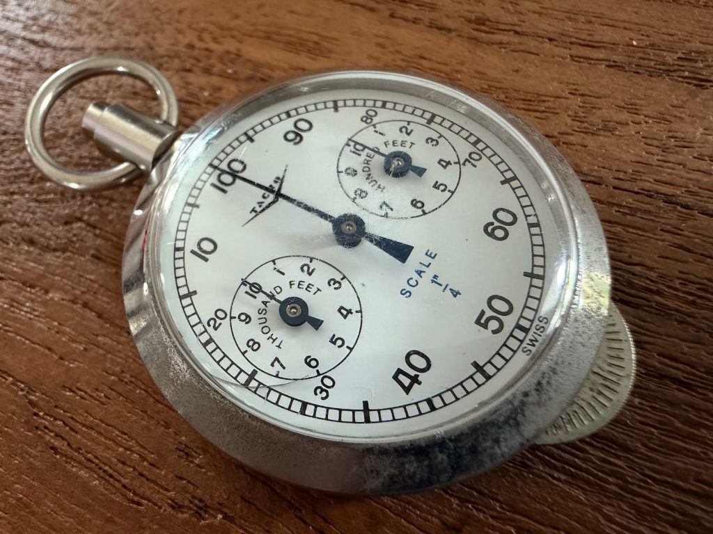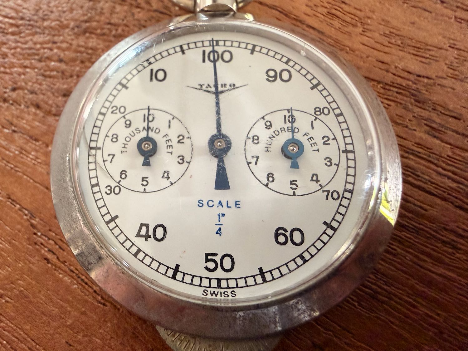 Tacro is een Zwitsers merk (handelsnaam), wellicht door ASI in Zwitserland geproduceerd. Waarschijnlijk jaren 50, alhoewel hij er strak / ,podern uit ziet. Erg luxe met de drie wijzerplaten. Erg blij mee. Ook weer uit USA en dus in feet en met dure verzendkosten en lange wachttijden, we’ve got him !