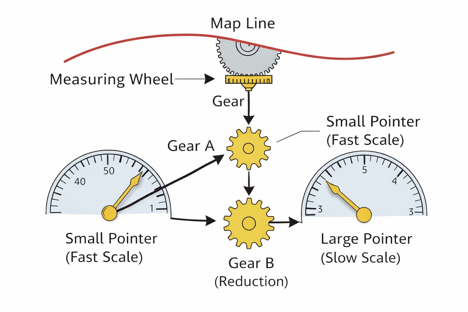 Kaartlijn > Meetwiel > Tandwiel A > Tandwiel B (reductie) > Grote wijzer (langzame schaal)