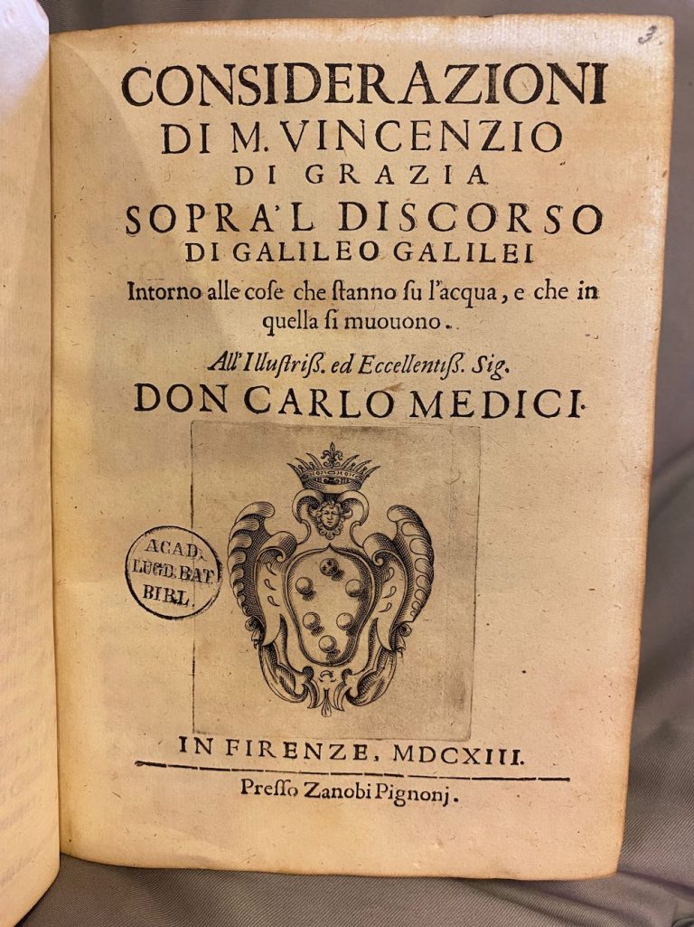 Discorso al serenissimo don Cosimo II van Galileo Galilei uit 1612, Geen fraai titelblad, maar wel een zeer fraai embleem met relatief lage resolutie. Volg de link voor detailfoto’s.