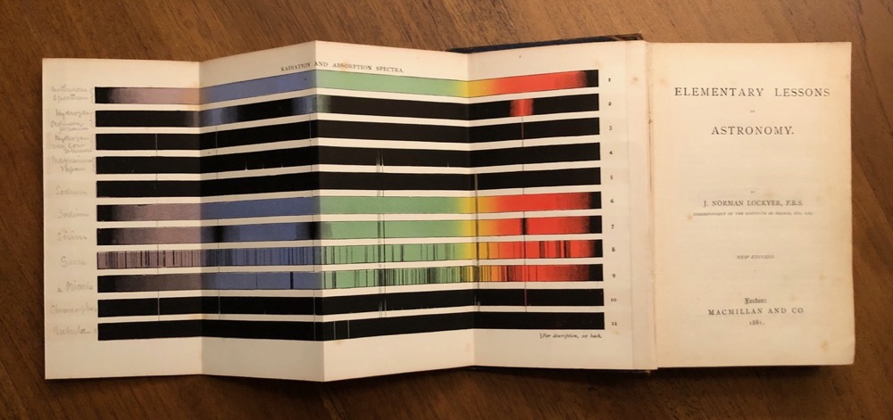 Elementary Lessons in Astronomy door Norman Lockyer uit 1881 met een zeer fraaie uitklap ‘poster’ met spectrografie van diverse bronnen.