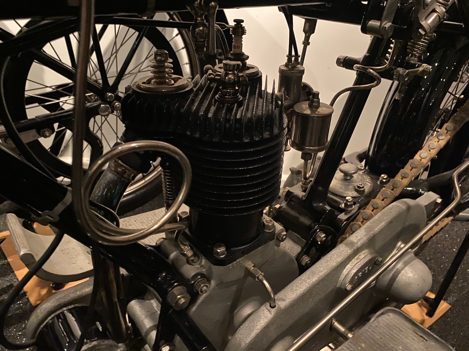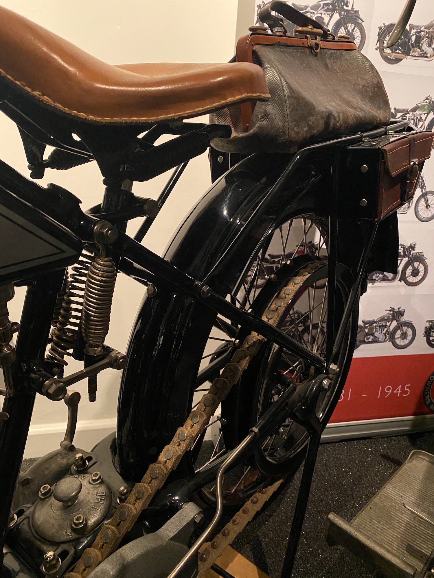 BSA begon in 1910 met het maken van Motoren. Deze Model-H werd van 1914 tot 1926 geproduceerd. Met 557cc in de zijklepper goed voor 4,5 PK. Primaire en secundaire aandrijving beide via ketting. Riem is mooier, maar dit is wel praktisch…