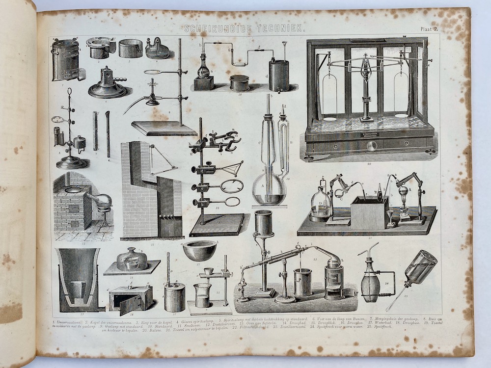 Oorspronkelijk een Duits boek, vertaald door D. De Loos. Hierboven en onder prachtige illustraties van het Scheikundig Laboratorium van Leipzig. Zie al die fonteintjes bij elke tafel: Moet toch machtig mooi zijn geweest om in zo’n luxe omgeving te mogen werken.