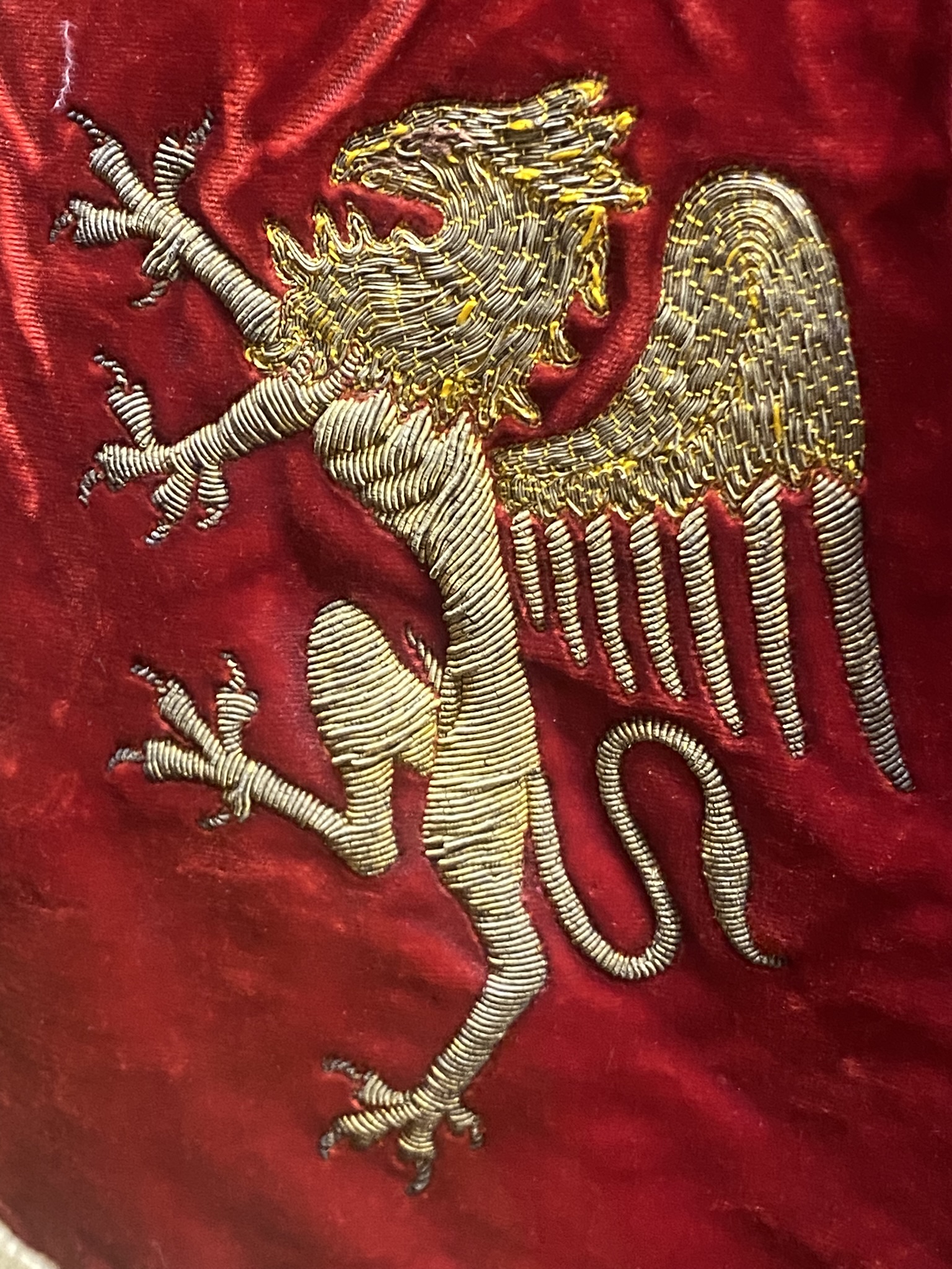 Veel displays met de tenues. De Palio wordt al sinds 1289 gereden elk jaar, dus er zullen wt antieke pakjes tussen hangen. Mooi om te zien dat in dit kleine specifieke stukje geschiedenis de Griffioen zo’n mooie rol speelt.