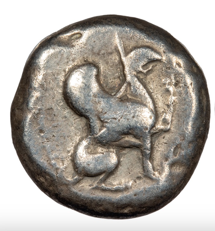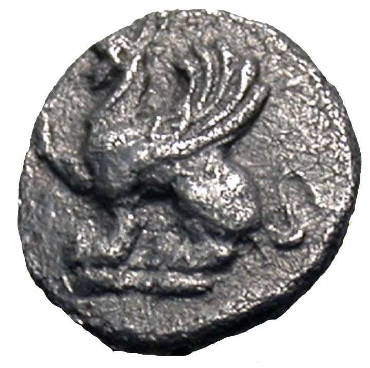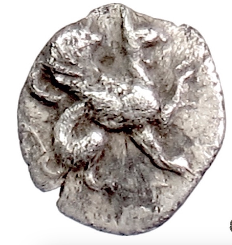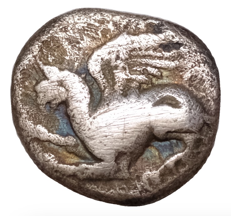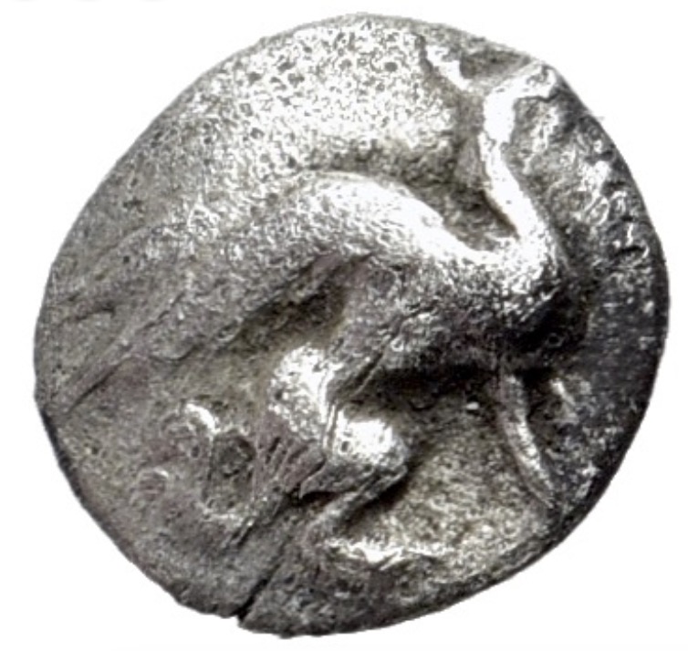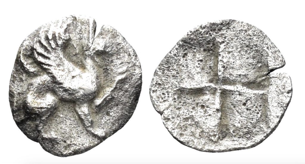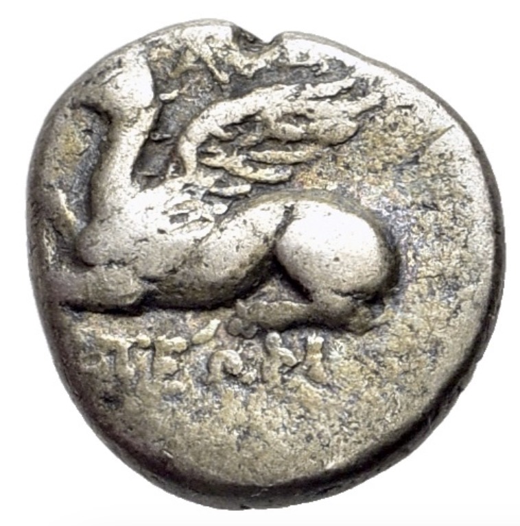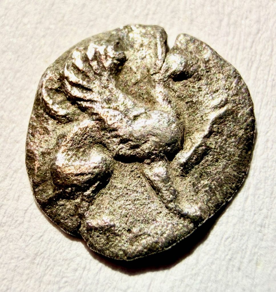 Wat betekent die beschrijving – die ook voor mij nieuw is… De munt komt uit Teos, een Griekse stad in Ionië (in Anatolië, aan de westkust van het huidige Turkije). Geslagen ongeveer tussen 450 en 425 v.Chr., in de klassieke Griekse periode (tijd van Perikles en de Peloponnesische Oorlog).