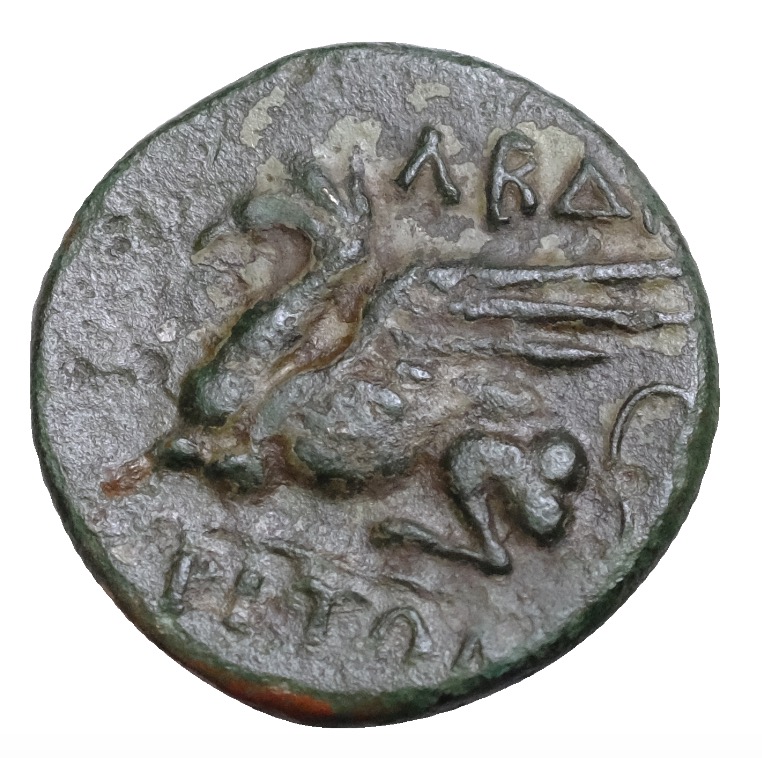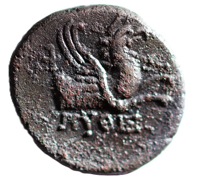 Over deze munt: In deze periode sloeg Alexandrië zijn eigen munten, los van Rome, met een heel herkenbare stijl. De waarschijnlijke inscriptie aan de voorzijde is niet meer leesbaar, maar luidde zoiets: Keizer Domitianus, de Verhevene. Betekenis van de griffioen: Symbool van macht en waakzaamheid, bewaker van schatten en heilige kennis. Verbonden met: Apollo (Grieks), de zon, en indirect met koninklijk gezag. In Egypte en Alexandrië werd de griffioen ook gezien als: een beschermend wezen, dat orde bewaakt tegen chaos: Perfect propaganda-beeld voor een keizer.