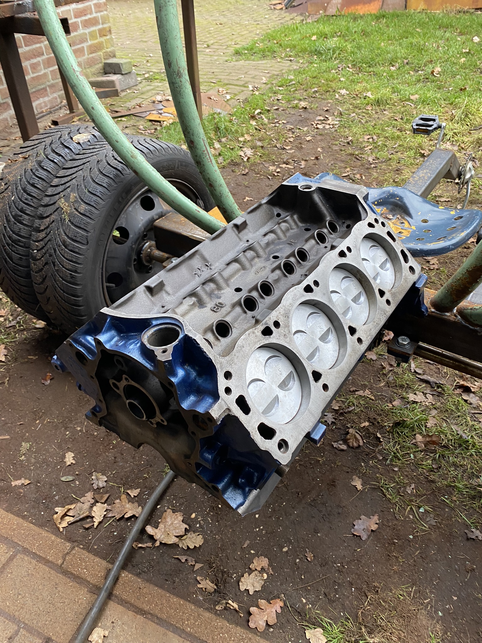 Een prachtig aanbod van Lon en nog ‘leeg gehaald’ ook nog om hem niet té zwaar te maken. Een dikke 8 cilinder uit een Ford Windsor CID 5-liter van 316 PK, nog met de zuigers erbij. Straks deels in de juiste kleur en dat extra gewicht achter de achteras kunnen we nog wel eens iets leuks mee gaan doen ! De vorken zijn te lang dus de zuigers kunnen er nog niet in: even met de slijptol nog wat gewicht besparen… Bijna sund.