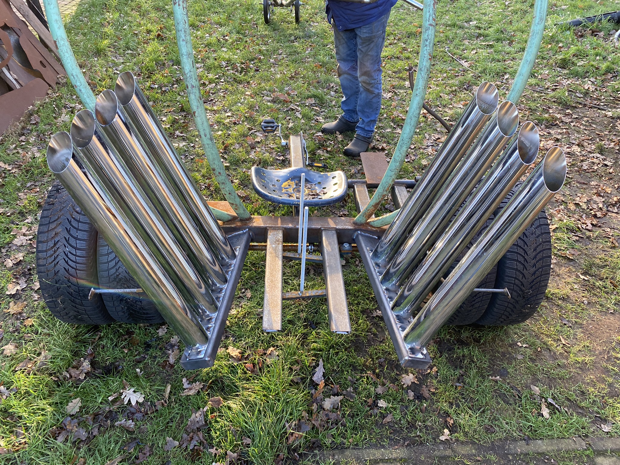 Vervolgens alvast de eerste sierboog aan de buitenkant toegevoegd, dat was al best trial en error om hem mooi passend te krijgen, nou de tweede nog hetzelfde zien te krijgen: “Da make wij!” Wel mooi dat het nu allemaal losse bogen zijn zonder connectie-punt. Dit gaat helaas nog wel veranderen omdat er oa nog een stuurinrichting moet komen. Even kijken hoe ww dat mooi op kunnen lossen. Da’s voor later: voor nu staat ie achter in de wei geparkeerd; volgende keer weer verder.