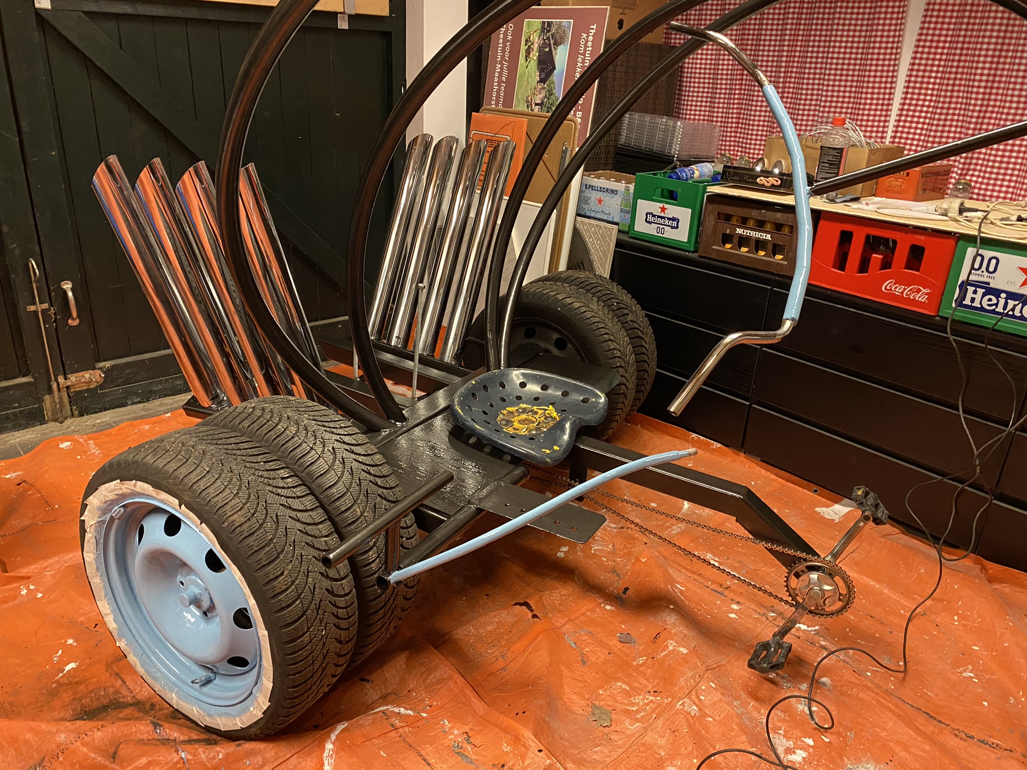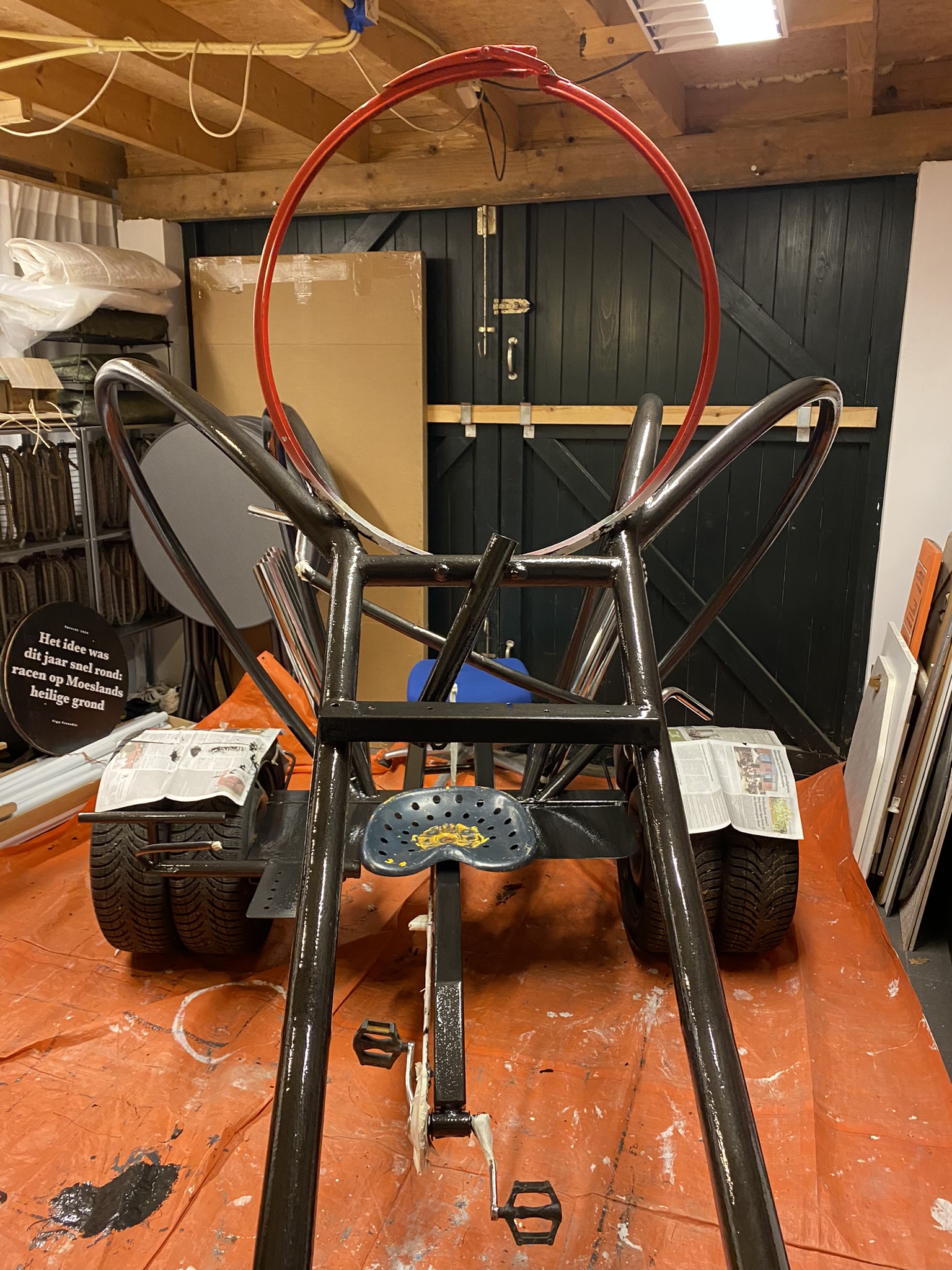 Al dat werk en dan met een kapotte ketting langs de kant staan, dat zou sund zijn. Daarom maar even een paar onder meter proefritje en dat ging prima. Ketting knarste wel bij het op gang komen, dus tijdens de optocht maar even laten duwen af en toe… Ging verder prima. De uitslag van het stuur is ruimer dan de uitslag van de sturende voorwielen, dus hij raakt het frame. Bietje bijtippen naderhand. Hij is wel lang met zijn 550cm, maar wel wat iellekes. Startnummer bord zal wat volume geven, maar daar ga ik nog even naar kijken. Vooralsnog een vette bak !