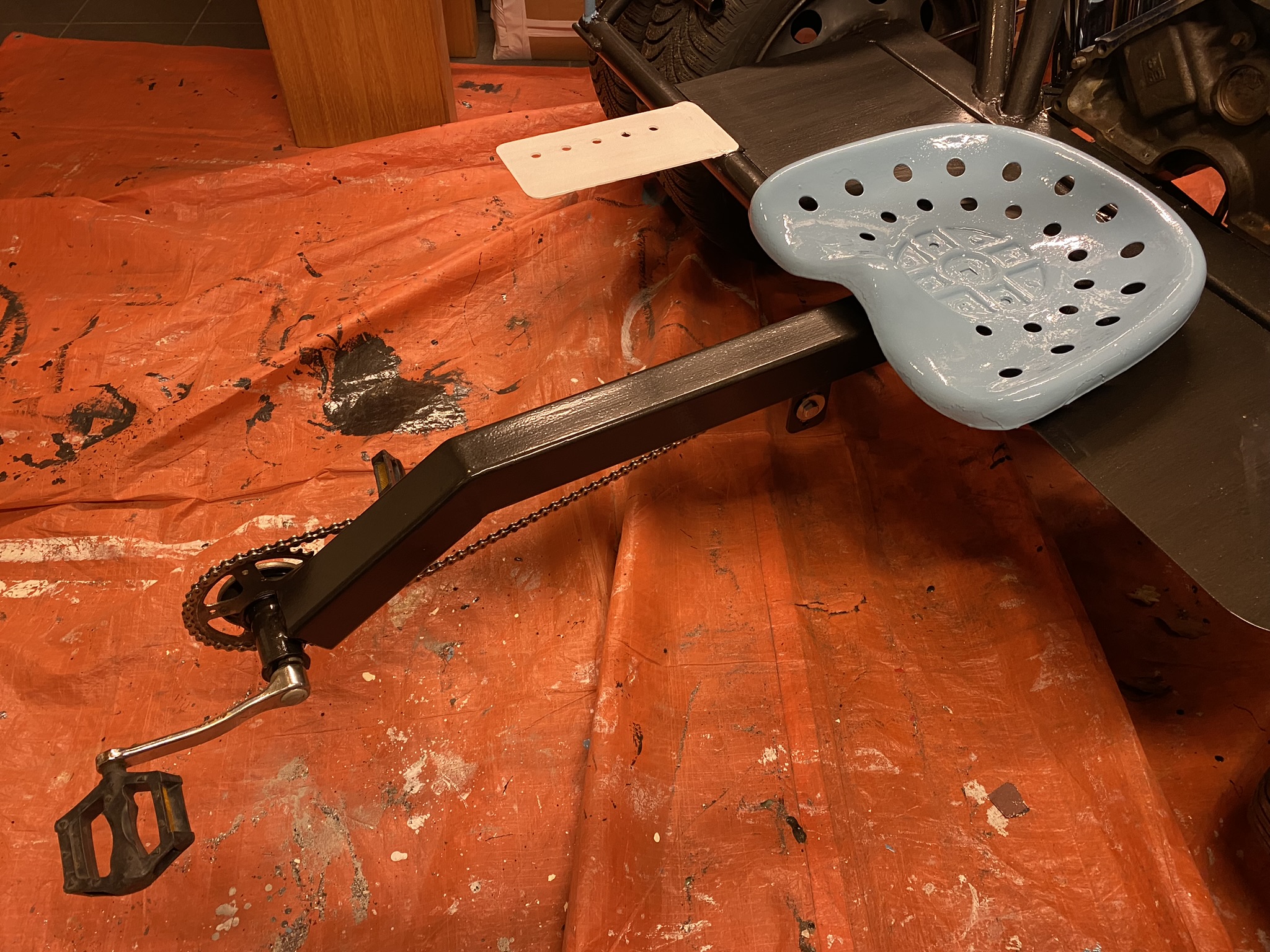 Onder het zadel (en in de foto hierboven zie je het vrijloop tandwiel al zitten. Complete fiets gekocht voor een tientje om het krank-stel van te gebruiken. (Wielen, zadel en stuur komen wellicht ook nog ooit van pas) Zadel erop, meten en lassen maar. Ervoor gekozen om naar beneden te trappen ipv lui omhoog zodat er geen kettinggeleiders nodig zijn om de ketting de bocht om te helpen: nu is het gewoon 115 cm rechtdoor. Ketting scoren en dan kunnen we het proberen: wellicht wel 1 spanner om hem goed strak te laten staan… Volgende week weer verder; dan minder herstelwerkzaamheden en meer vooruitgang. (We hebben namelijk ook de bogen losgeslagen en de as-balk weer horizontaal gezet, dat maakt alle vervolg stappen een stuk makkelijker)