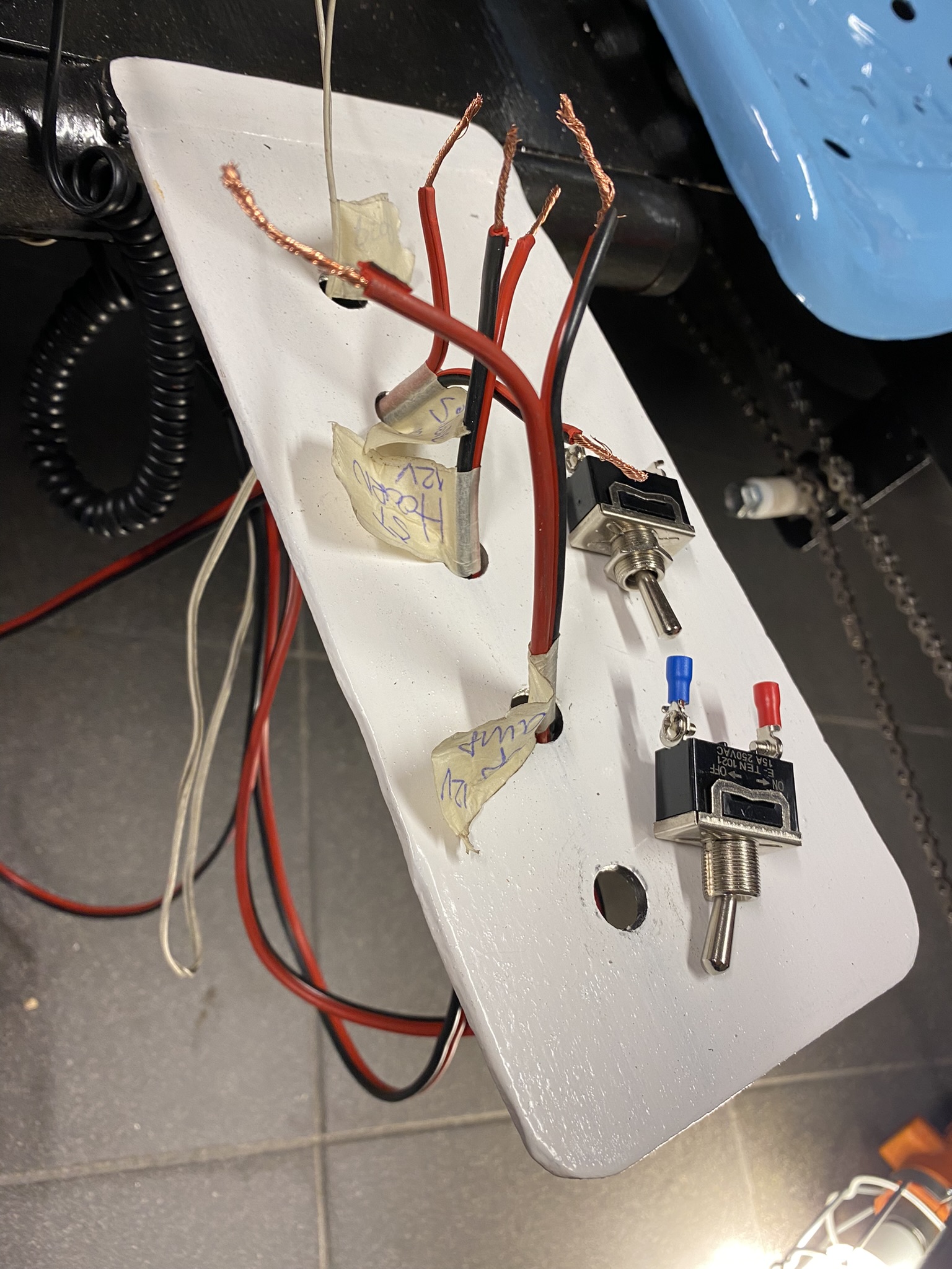 Wem zijn begonnen, maar met 12V en 24V door elkaar, 2 accu’s, 5 apparaten en een hoofdschakelaar ging er toch iets mis en zijn er twee schakelaars doorgebrand: even weer 5 voor nog geen twee euro bijbestellen. Het werkt nu wal allemaal, maar even wachten op de schakelaars, dan kan ik het netjes afmaken en wegwerken. Update 20250202: Zo snel ging het niet. Lassen werkte niet en nu dus een oplossing met een bout en moertjes. Ook de schakelaars en kabels gaven nog wat problemen doordat de schoentjes verkeerd waren vastgeknepen en zo dus makkelijk los schoten. Nu alles gesoldeerd, zodat het er sowieso niet meer uit kan. Hoop ik.
