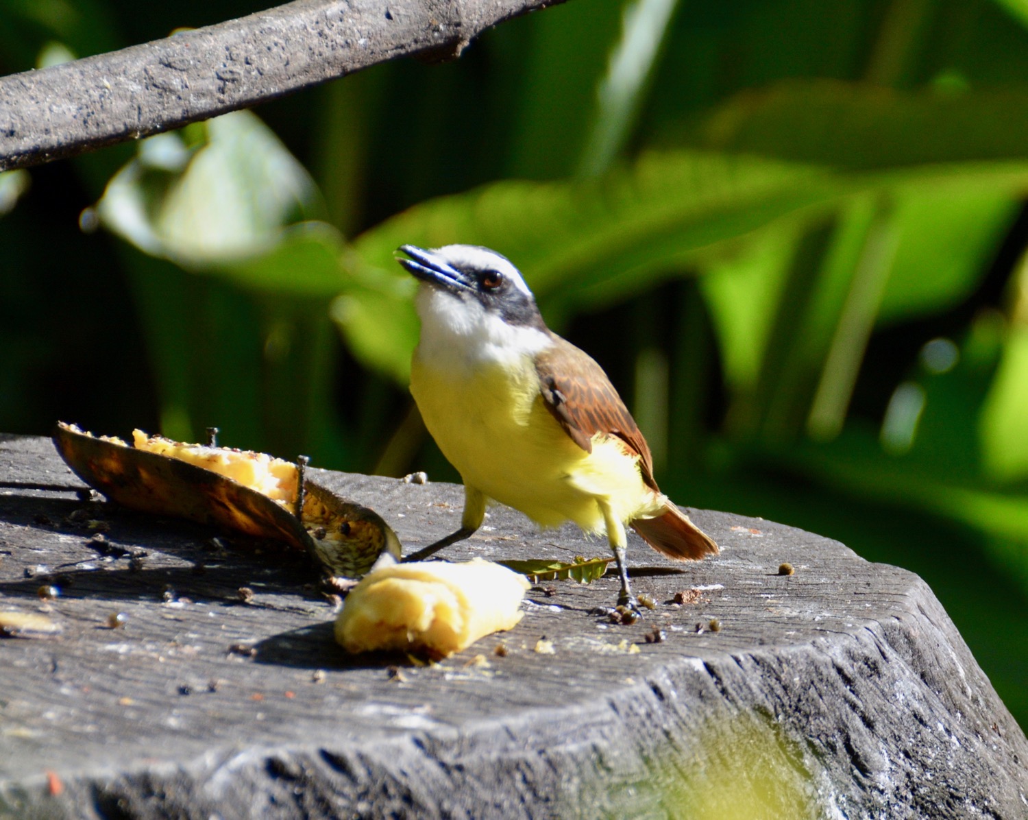 Buiten zagen we meteen hagedisjes, groene pijlgifkikkertjes en kolibri’s. Dat kleine scheetje rechtsboven zat in de badkamer. En linksboven kijkt netjes in de camera 😉 Een paar hebben we al vast kunnen leggen. Evenals de duidelijk herkenbare vleermuizen die aan het dak van onze veranda hingen.