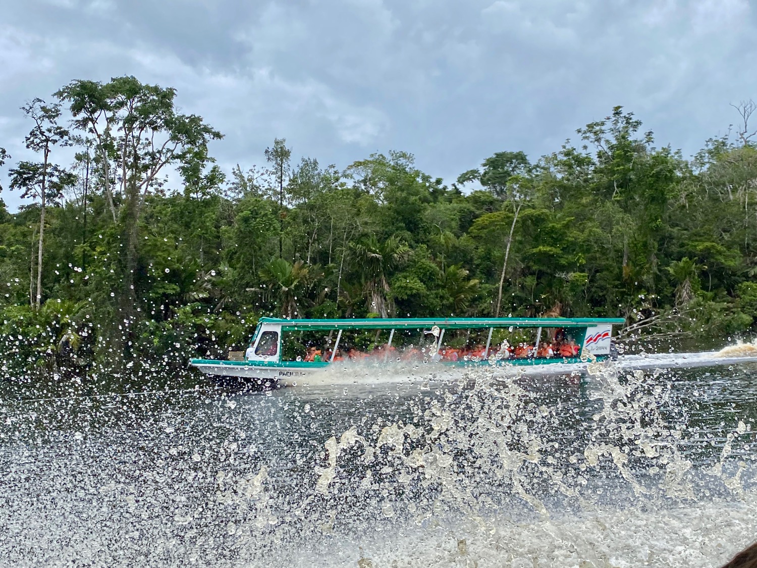 Aanvankelijk hadden we een iets kortere reis, maar als we dan toch uit gingen pakken, dan ook naar de zeeschildpadden in Tortuguero dacht Dominique en dat werd onze eerste stop. Geen moment spijt van, bijna net zo gaaf als toen we dik 20 jaar geleden de Gorilla’s in Oeganda konden zien. Machtig mooi dat je dat als gezin mee mag maken. Per luxe bus vertrokken we naar Guapiles voor ontbijt en daarna door naar de boot. De weg naar de opstapplaats Caño Blanco, waar we op de boot gingen was al prachtig. Deels over goede wegen, en deels over hobbeldebobbelwegen omdat ze hier vanalles starten, maar niets af maken… De laatste 45 minuten continue tussen de bananenplantages