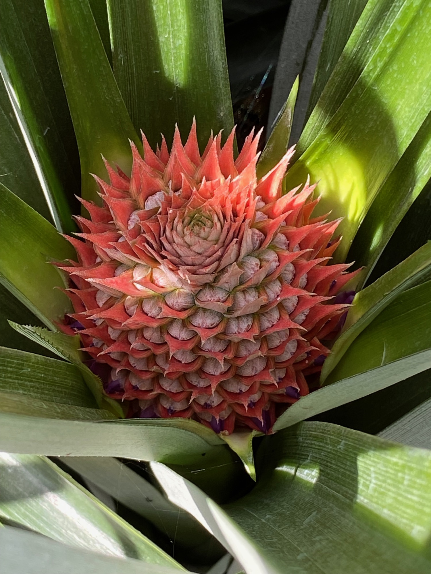 Onderweg naar onze 4e bestemming kwamen we weer langs een ananas veld, en nu toch maar eens even gestopt: vanaf de weg zie je namelijk geen enkele ananas, maar nu weet ik hoe het zit. De ananassen zitten diep verstopt tussen de sprieten. Hier een paar nog mooi klein met de bloesem eraan en een die helemaal volgroeid is. In Nederland zijn ananassen van bitter van ‘afdronk’ door gif, conserveringsmiddel of transport. Hier zijn ze zo heerlijk zoet en sappig, niet te geloven !