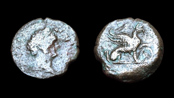 Over deze munt: In deze periode sloeg Alexandrië zijn eigen munten, los van Rome, met een heel herkenbare stijl. De waarschijnlijke inscriptie aan de voorzijde is niet meer leesbaar, maar luidde zoiets: Keizer Domitianus, de Verhevene. Betekenis van de griffioen: Symbool van macht en waakzaamheid, bewaker van schatten en heilige kennis. Verbonden met: Apollo (Grieks), de zon, en indirect met koninklijk gezag. In Egypte en Alexandrië werd de griffioen ook gezien als: een beschermend wezen, dat orde bewaakt tegen chaos: Perfect propaganda-beeld voor een keizer.